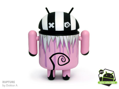 My favorite of the three new bots is called Racer. It's in a racing green color with white stripes. On the chest of the toy is a printed window with a little Android bot driving. It's like the Shelby version. A pink version called Rupture is offered too that looks like a black and white head has popped out of a pink suit.