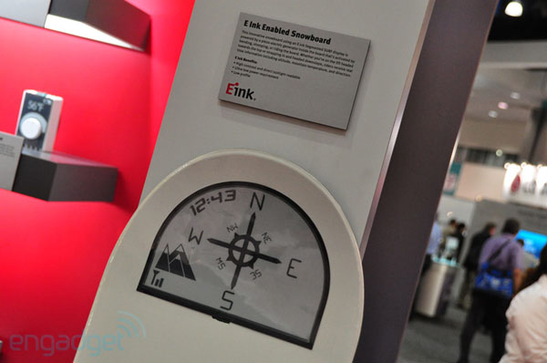 The E Ink display is a very cool bit of tech. The displays are easy to read in direct sunlight and they need little power to operate. Over the years since the E Ink screen debut, they have found their way into all sorts of devices from eReaders to watches with lots of stuff in between. At SID 2011, a new use for an E Ink screen surfaced and it is a first. The large screen you see there is on the nose of a snowboard. I hope it's rugged.