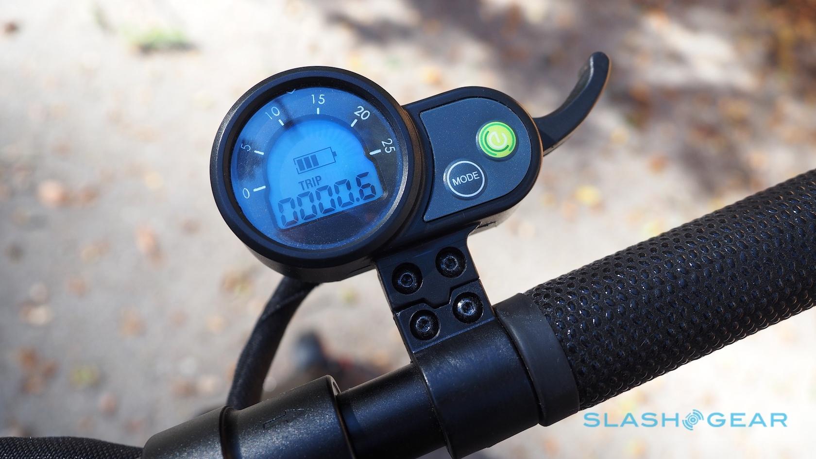 Control is via a small lever mounted on the right handle, with a blue-backlit display, a power button, and a mode button that switches between showing speed, the odometer, and charge status. There are no front or rear lights for evening use, though you could easily strap on some LED bike lamps.