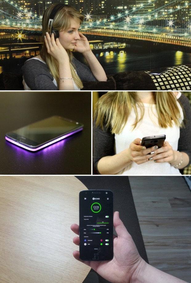 In addition to adding an RGB strip of light to the Moto Z and adding battery power, this device is a wireless charging receiver. Power can be sent to the battery which is then sent to the phone.