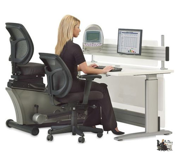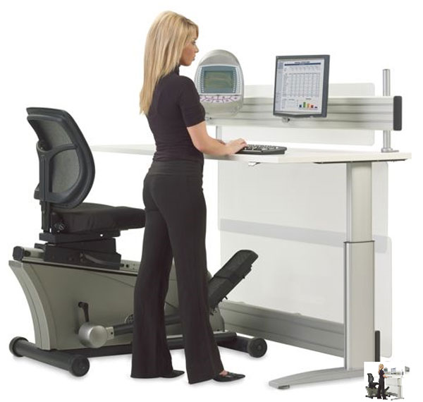 We can be honest here we are among friends. No matter how cool your job is, work sucks. It's a life sucking, free-time killing proposition no matter how you cut it. Some jobs are better than others, but there are still days when you just don't want to be there. I know a bunch of people that blame their jobs for their weight issues. Hammacher Schlemmer has a new desk that gives you no excuse to be fat and pasty even if your job keeps you chained to a desk all day. The desk setup is called The Elliptical machine Office Desk.
