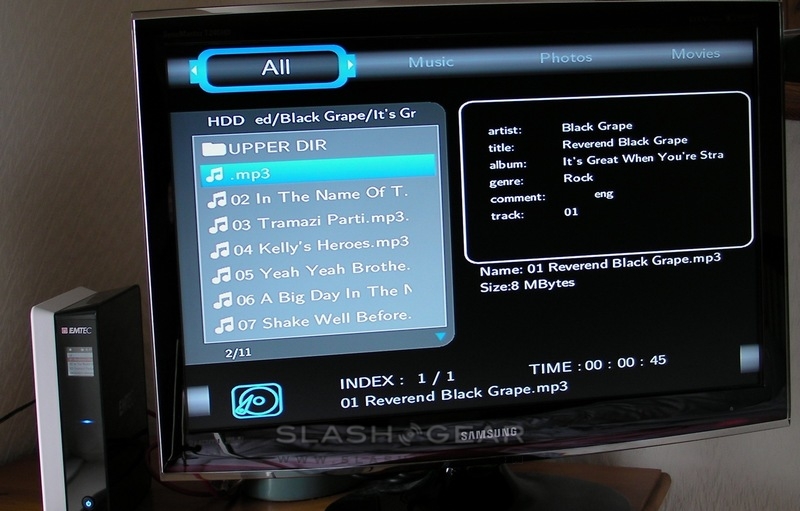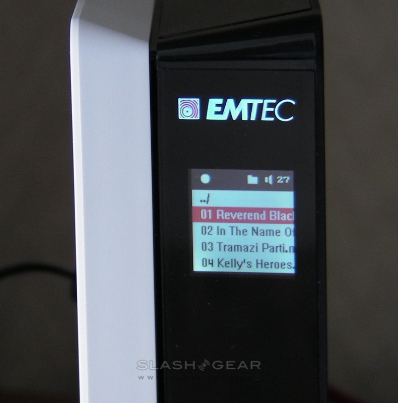 Saying that, the display is an exercise in frustration. While it usefully shows tracklists during music playback, theoretically letting you navigate without having your TV switched on, it's so small and the viewing angles so surprisingly narrow that you need to be very close to make use of it. By the time you're near enough, you wonder why Emtec didn't include on-device controls as well as the remote, especially as navigation can sometimes be sluggish.