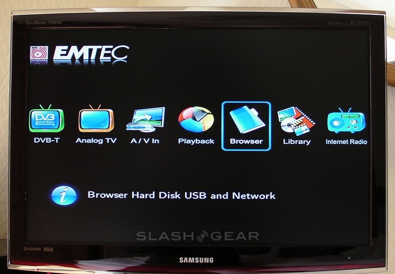 For the US buyer, the only way to watch video on the Movie Cube is pre-recorded content. That can be stored locally – capacities range from 250GB to 1TB – or on a USB hard-drive hooked up to one of the Emtec's two USB 2.0 host ports. Anything that will mount as a mass storage device can be connected, in fact, from USB keys to MP3 players to huge RAID arrays, and you can choose to record anything from the TV tuner direct to this drive. The Browser is used to navigate both attached USB drives or shared network folders, with a simple folder/file structure; anything saved to the S800's internal storage gets a more streamlined interface through the Library option. You're able to easily copy a file from remote storage to local, or vice-versa; obviously the speed at which this is achieved depends on the network connection. For initially loading up the S800's storage with video, we plugged it directly into our PC (it shows up as a mass storage device) rather than wait for files to transfer wirelessly.