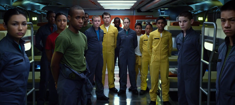 The rest of the trailer is full of quick flashes of major plot devices like the Battle School and the Battle Room it contains. There you'll see the big screen's interpretation of "stars" inside the Battle Room, Flash Suits, and even a recreation of one of the most entertaining moments in the book. What we must assume is that this is Bean, a character that shadows Ender throughout the book and here uses a thin cord to out-maneuver the enemy in a game at the school.