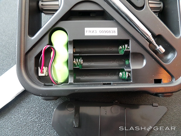 The turbine is quoted as giving between 10 and 15 minutes of radio and flashlight use per one minute cranked – and we've generally found that to be entirely accurate. If you're in an area where you've got your own supply of AAA batteries, you can feel free to use those too – and if you've got a wall socket, this machine takes in DC power via mini-USB. This machine also has the ability to "dump charge" your smartphone with its own USB port – plug your own microUSB cord in and let it pump up!