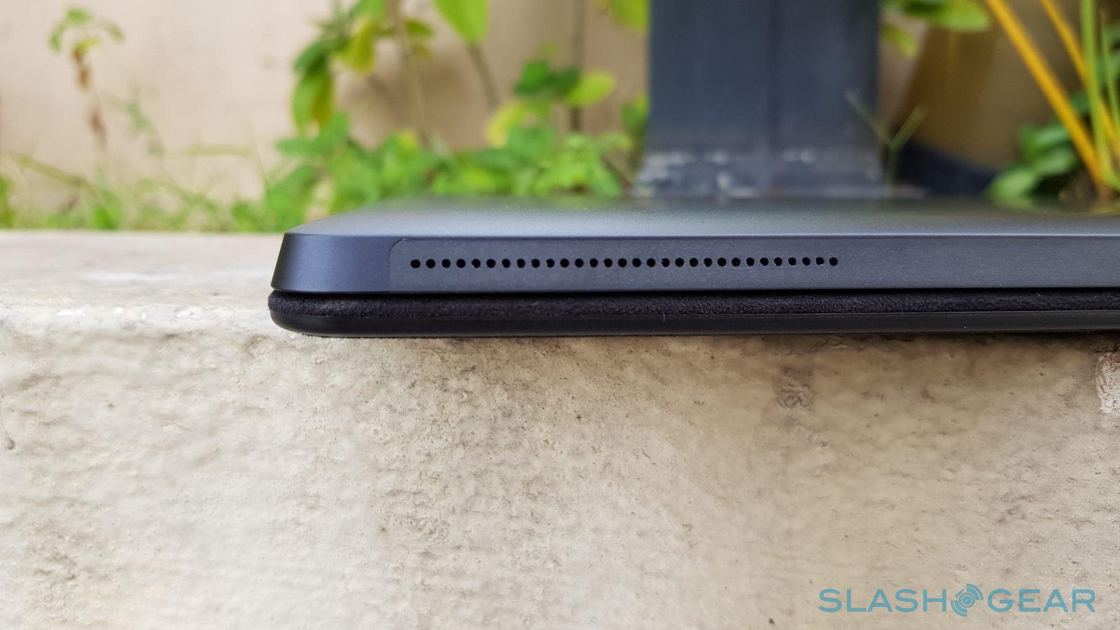For the audio, the Eve V actually has quad speakers, totaling 4 watts, though you'll only see two grilles at the top. Yes, they're at the top, which is probably one of the weirdest placement of speakers you'll find in Windows tablets, but it does mean your hands won't cover them whether you hold the tablet in portrait or landscape. The tablet has its own headphone jack amplifier and two noise-canceling mics to help Cortana hear you better.