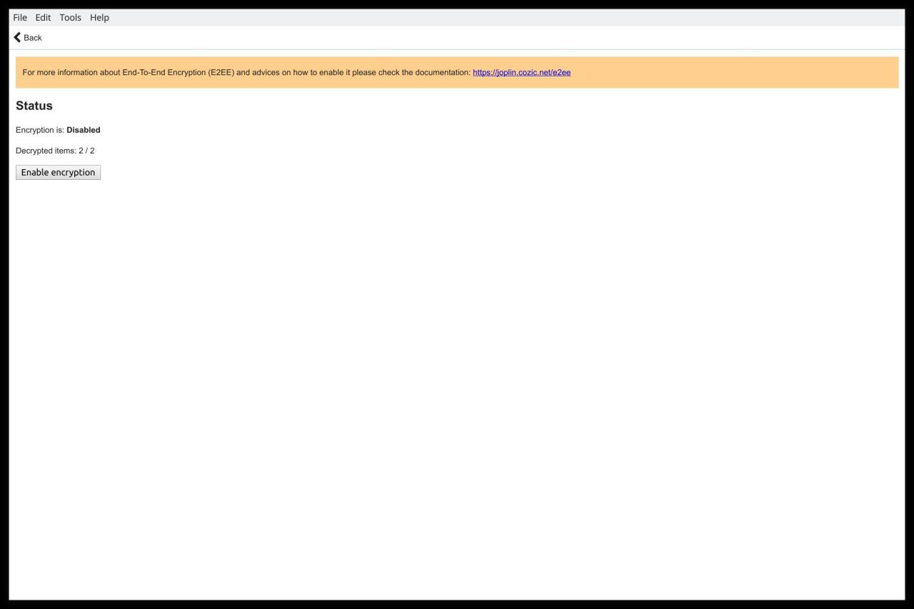 One thing Joplin doesn't exactly focus on but does support is encryption, specifically end-to-end encryption. That option exists but is disabled by default due to the decentralized nature of the software, or so the developer says. The setup is more involved compared to Turtl or Standard Notes which both do the heavy lifting for the user. It's one of the tradeoffs that Joplin's flexibility incurs.