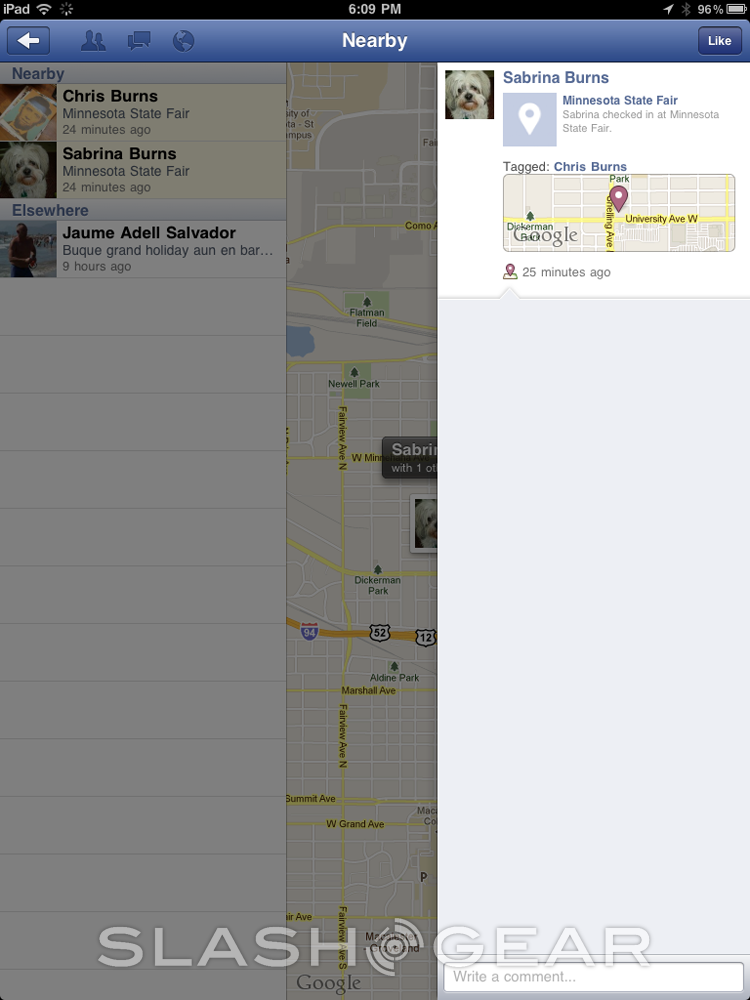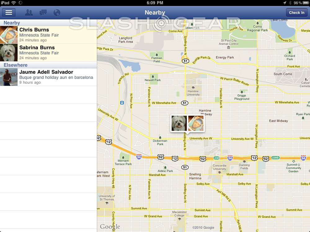 What we're looking at here is an attempt by Facebook to replicate your browser-based abilities across the board, with the notable exceptions of games and of course video chat. Instead you get some really nice gallery and location-based interfaces, the latter allowing you to see who is near you using Facebook, this done with check-ins based on GPS location. If you log yourself and a friend in to a location, you'll both appear on this map together. How cute!