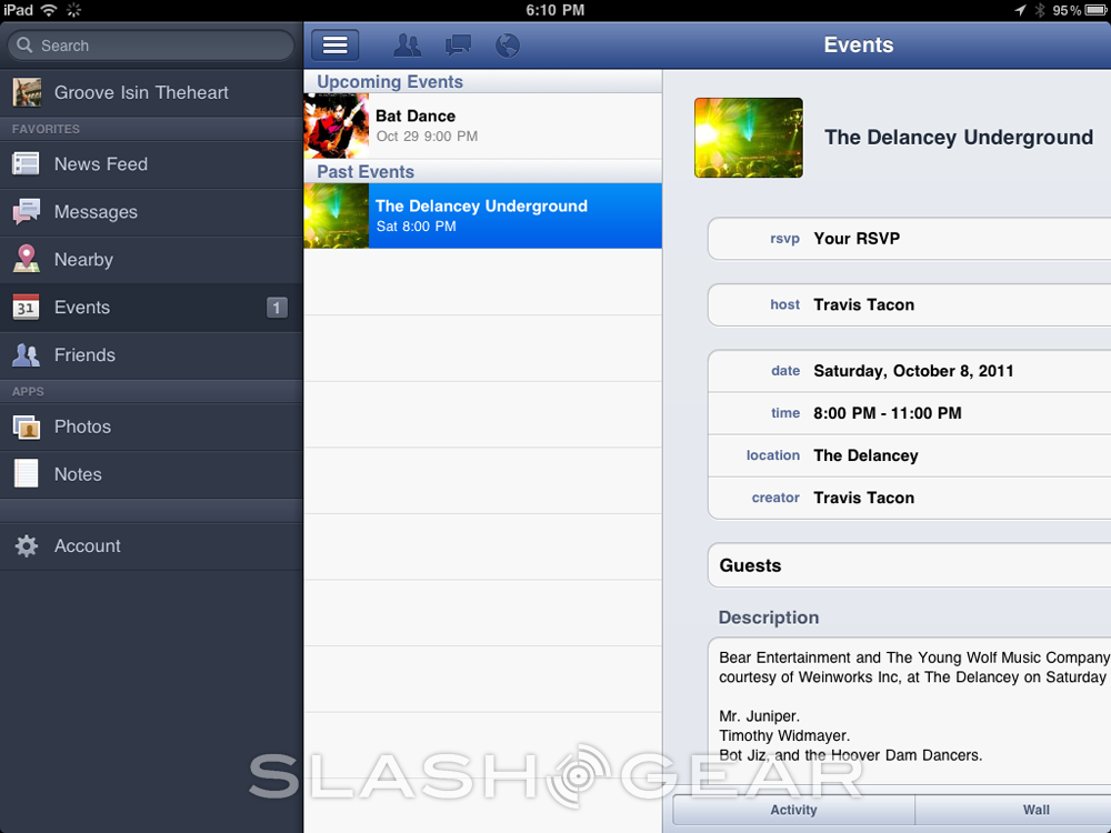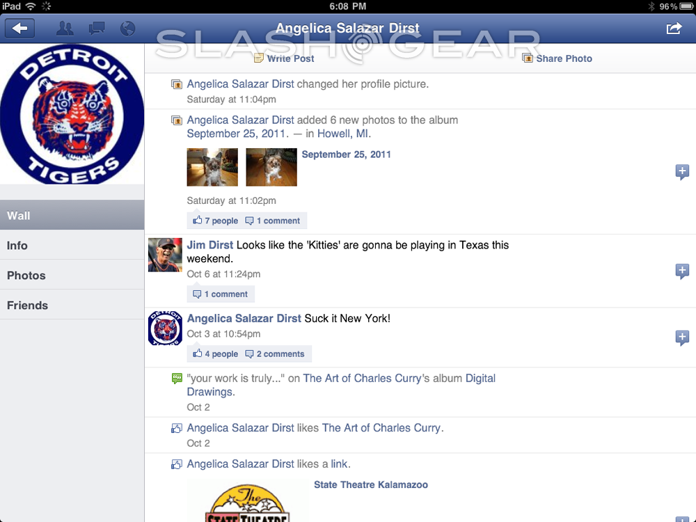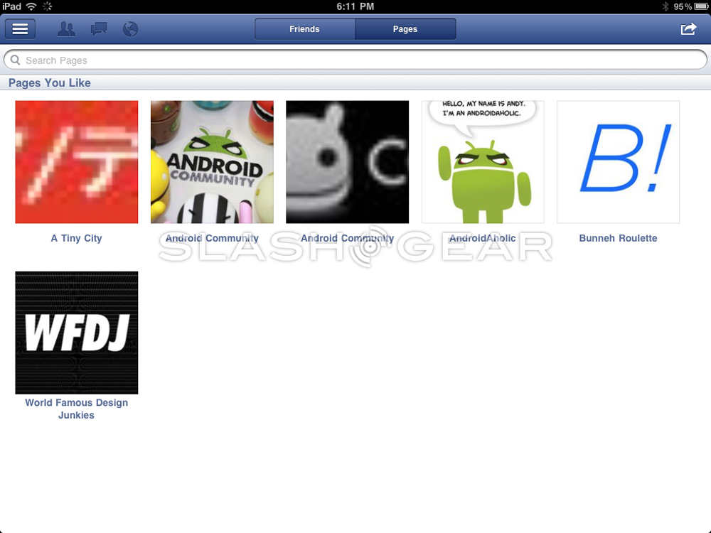 You can run alerts of all kinds through your iPad so you can see when you've got an update in essentially any part of Facebook, sounds attached. The difference between this app and the previous version of the iPhone-only app are that this version is obviously built for a much bigger screen, you're able to search through people, pages, and supposedly games – though we've been unable to access games anywhere as of yet.
