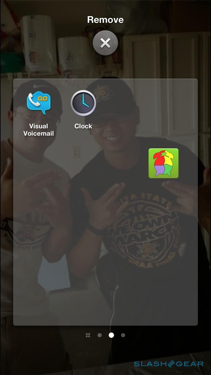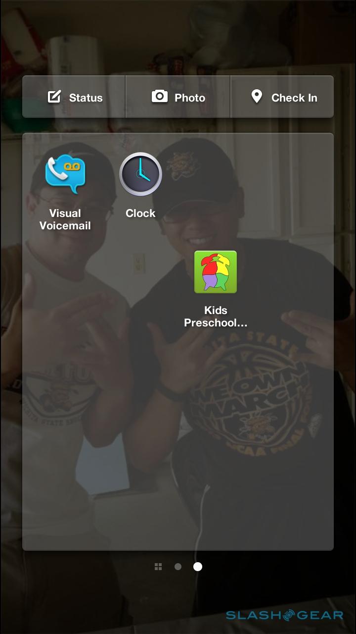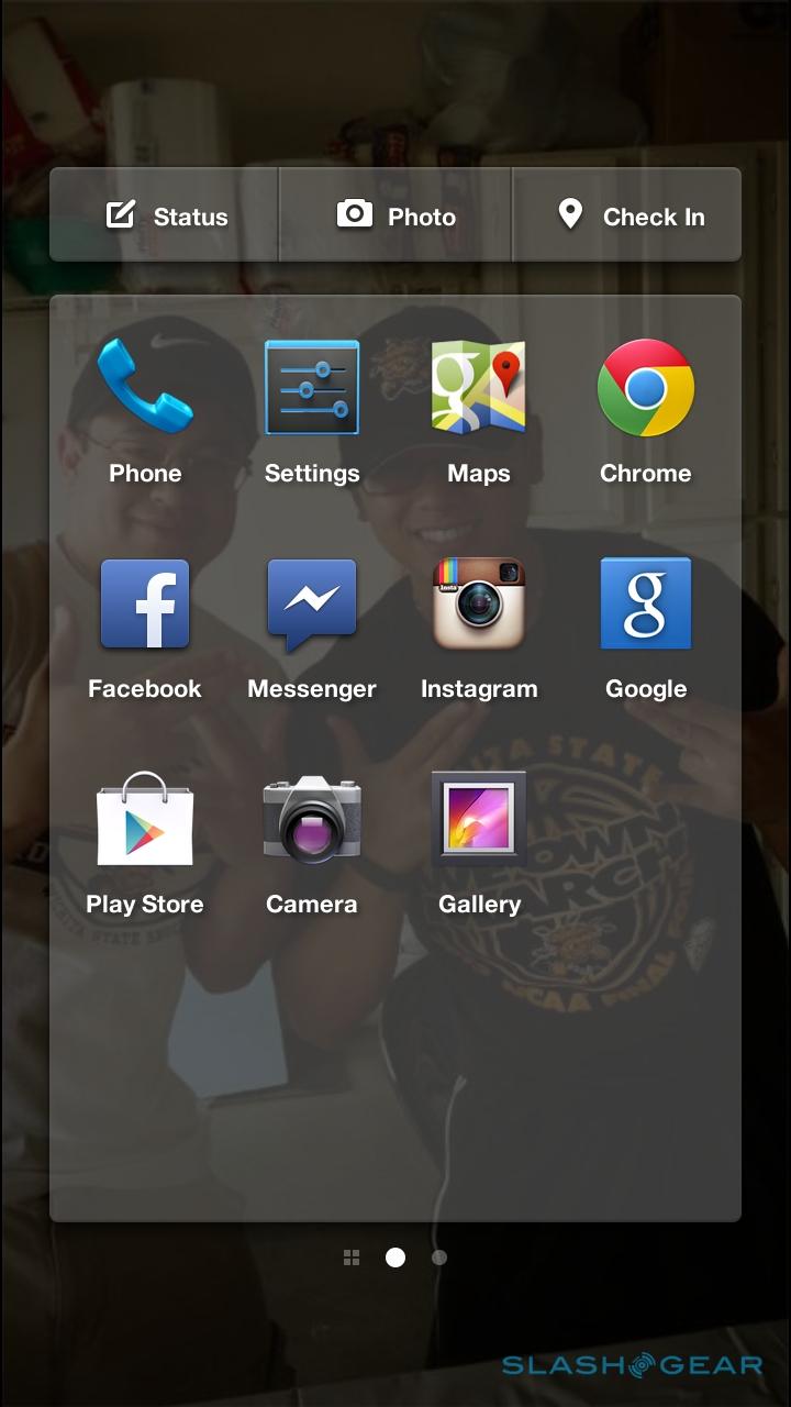 Drag the profile picture on the homescreen up, and the app launcher pane loads, a 4x4 grid of shortcuts that can be dragged and reorganized at will. Above it, there are buttons to post a new Facebook status message, a photo, or to check-in at your current location. Multiple pages of apps are supported, and you can drag new icons in by swiping to the left to open up the full app drawer and then bring them over to the main launcher pane.