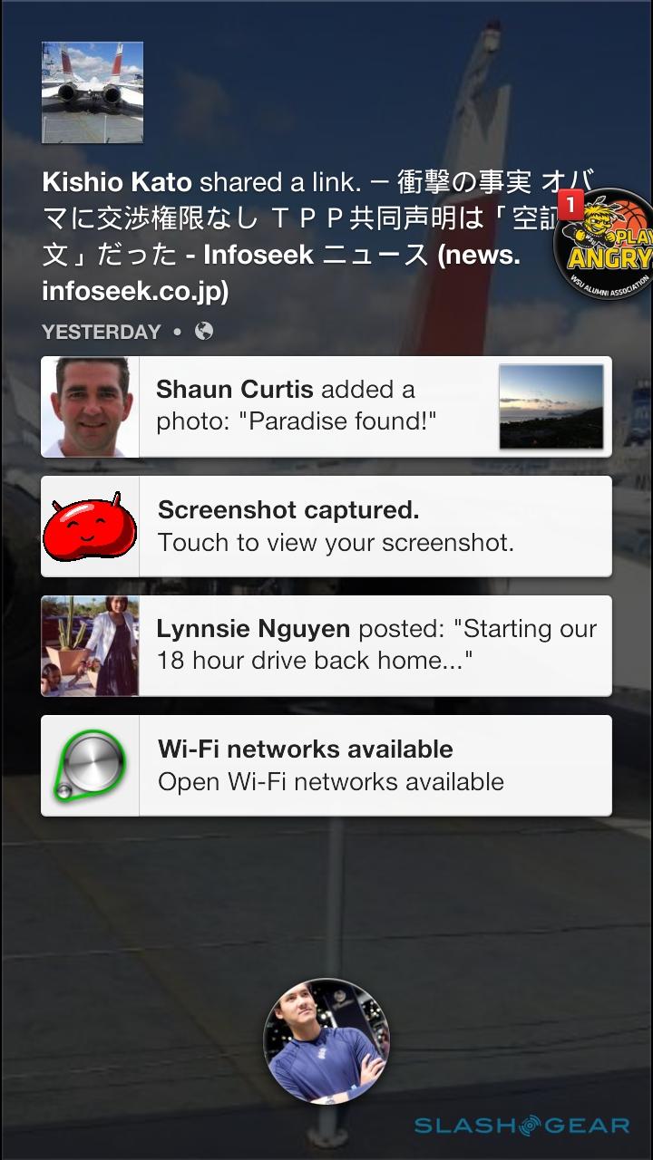 Chat Heads works well, though again there's a walled garden effect that will frustrate anybody who isn't entirely committed to Facebook for their messaging needs. The latest iteration of the Facebook messenger app pulls in SMS text messages, but it doesn't support Google Talk or other IM systems, and so the overall usefulness of Chat Heads is diluted.