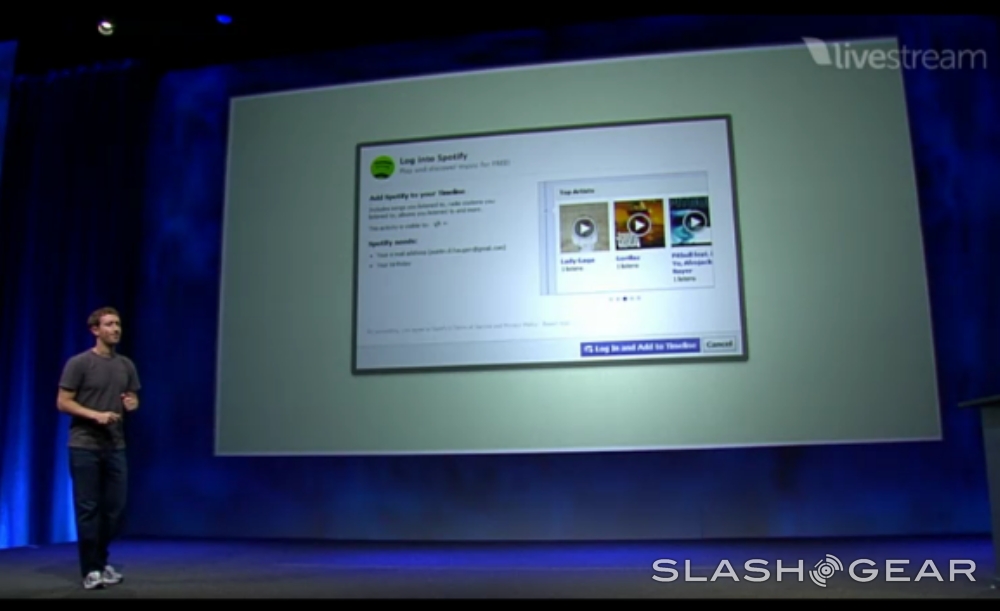 Frictionless Experiences and Real-time Serendipity are described with an example: Listen with your Friends – shown with Spotify as a single song (or a playlist) being shared on a news feed (or someone's Timeline) where you can click Play as well. Share with your friends on a whole new level.