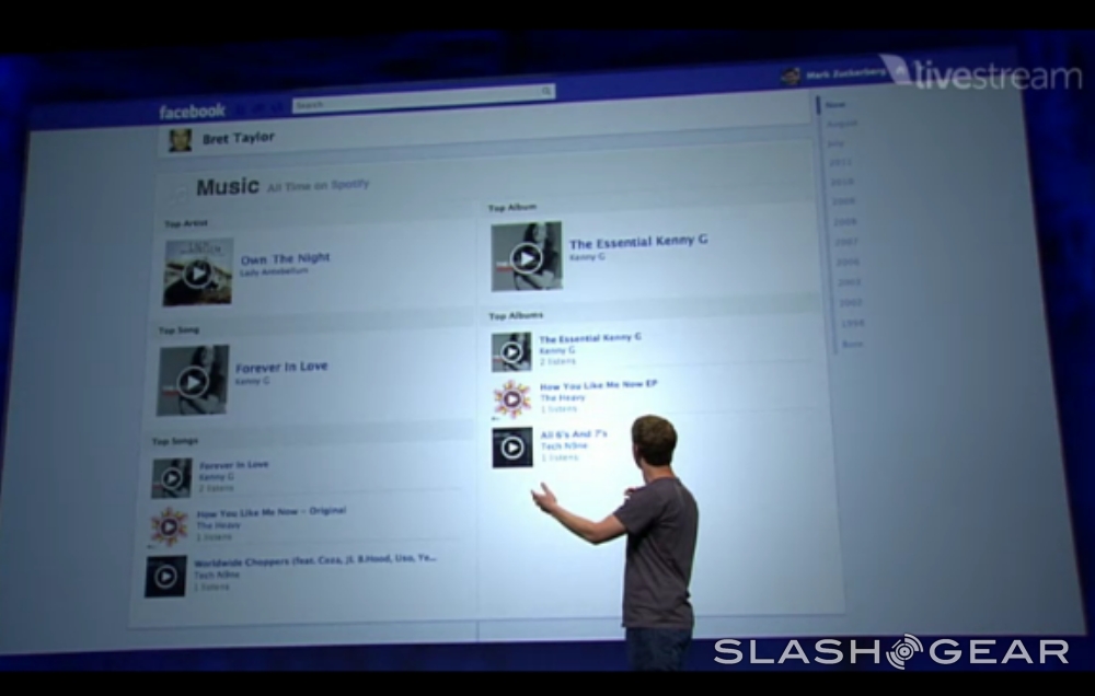 You've got a News Ticker to the right of your screen now, this announced earlier in the week before f8, where you can see activities your friends are taking part in. Again should they be playing a song, you can listen in as well. Zuckerberg plays Come as You Are by Nirvana and notes that it's the 20th anniversary of the song itself – neato.