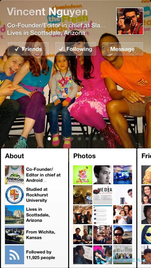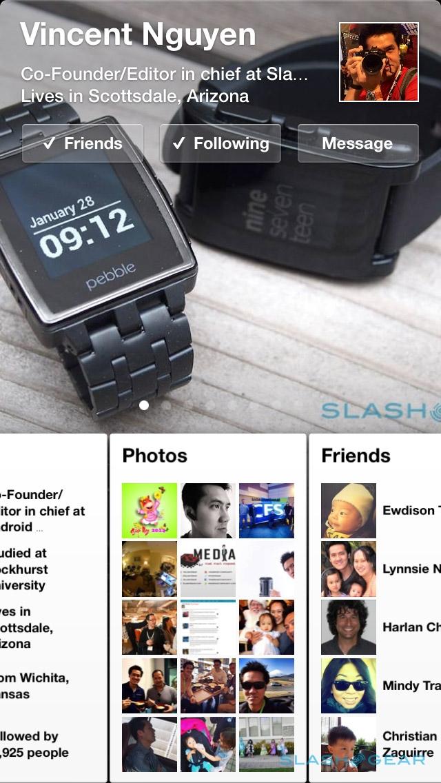 Tap on a friend's icon, or that of a page you follow, and you see their full profile, their contact details, and recent photos they've posted or been tagged in, and then you can side-swipe across to scroll back through their timeline.