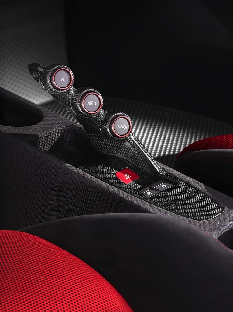 Maximum torque is 540 Nm at 6,000 rpm, with the 458 Speciale throwing that down through one of the company's paddle gearboxes. This time, though, the Ferrari has sprouted an odd carbon-fiber fin in the center console, putting the reverse, automatic, and "Launch Control" buttons on an arching strut that's almost Giger-esque in its design.