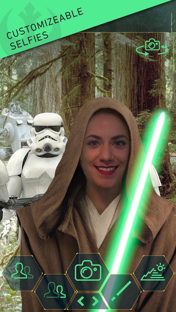 And what entertainment app wouldn't be complete without some kind of selfie feature? Thankfully the Star Wars app aces the category, letting users customize their photo with choices of backdrops, costumes, and even having other characters in the shot.