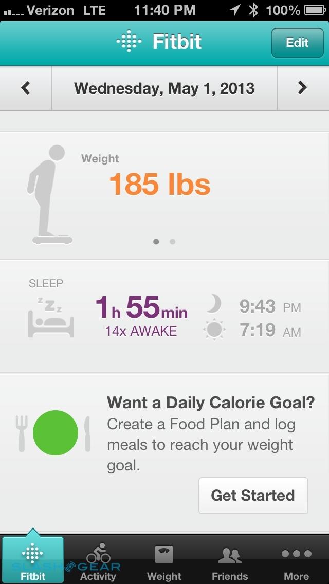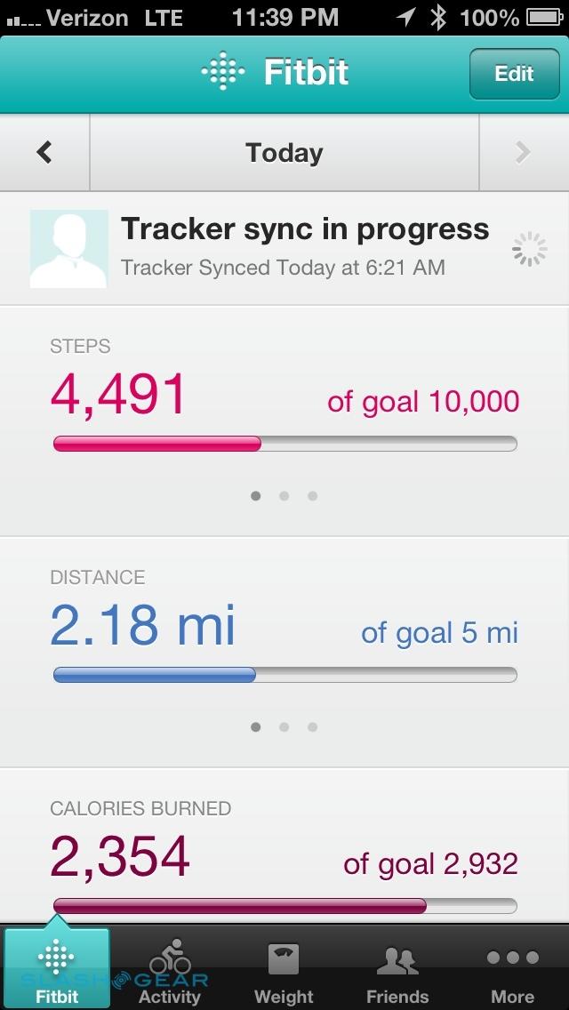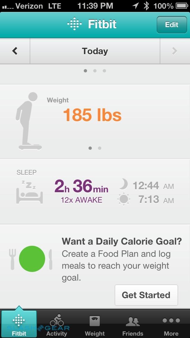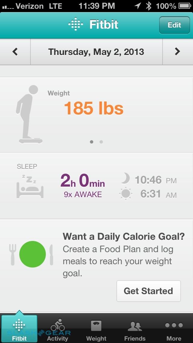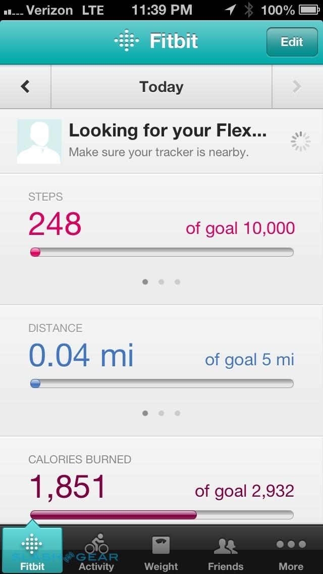 Assuming you have a compatible device, you see a timeline of your weight, sleep, and activity, as well as details from any friends who also use Fitbit and who have shared their progress with you. A public record is published online, though you can choose to pare back any of the specific activities, goals, and other information if you don't want them to be generally visible. Each of the progress made toward your step, distance, and calorie goals is shown on a progress bar; it's worth remembering, though, that Flex is only really tracking steps, and then calculating the probable distance and calories from that.