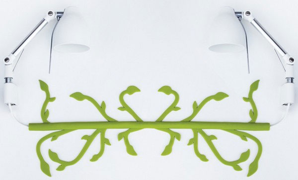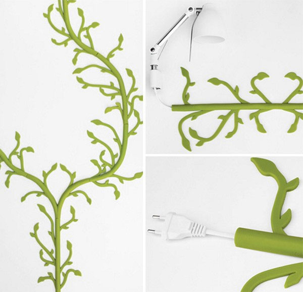 They were designs by Tania da Cruz and are concept devices at this point. The part that hides the cable is a half-round section with green branches and leaf shapes running off it. The cool part is that there are different shaped sections so you can create your own wall-mounted wire hiding tree with curves and such.
