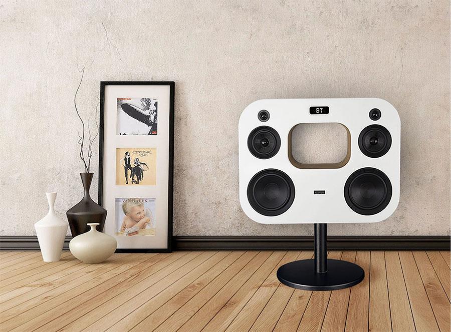 The design of the audio player has an opening in the middle and the unit is on an integrated floor stand. Bluetooth allows users to stream music to the Fi70 from sources like Spotify and others. AptX streaming tech inside helps improve sound quality from streaming sources.