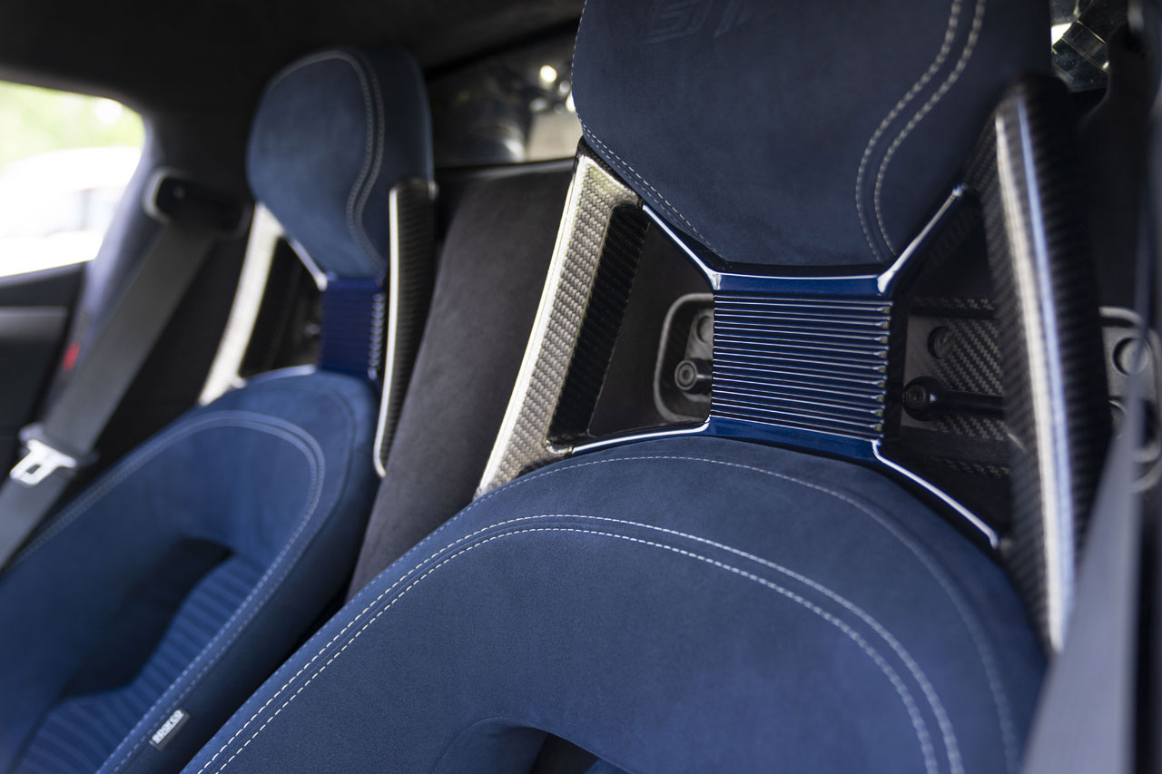 The Brembo brake calipers are painted in silver with black graphics, and the wheels are fitted with black lug nuts. Carbon fiber components are used inside the car as well, including carbon fiber door sills, lower a-pillars, console, and matte carbon fiber registers.