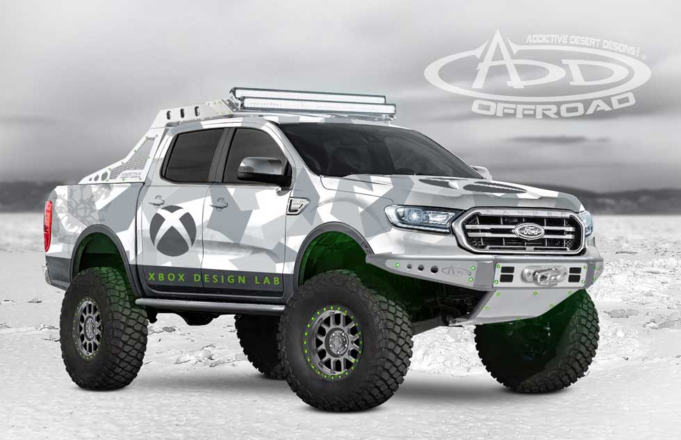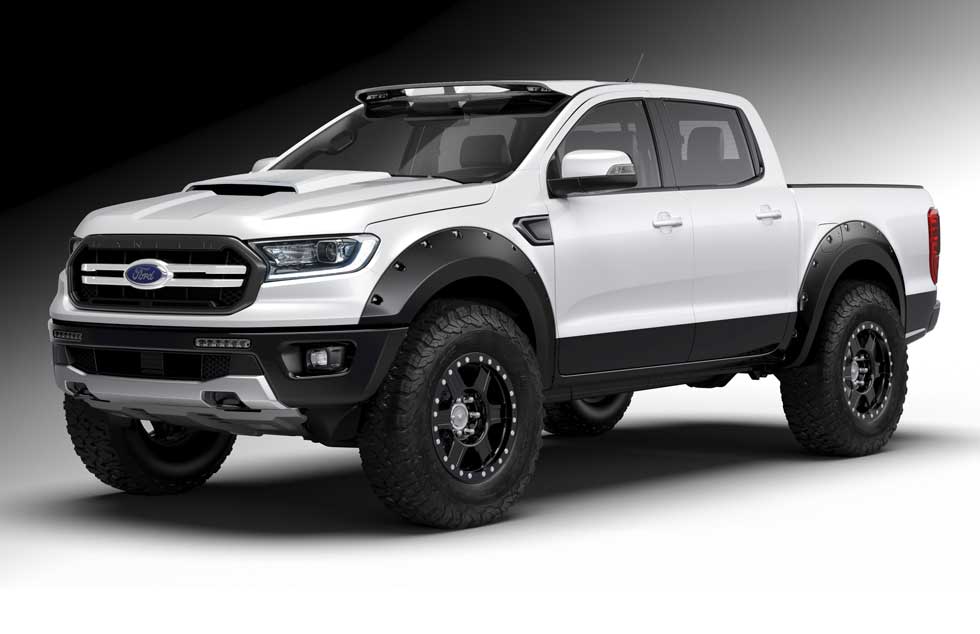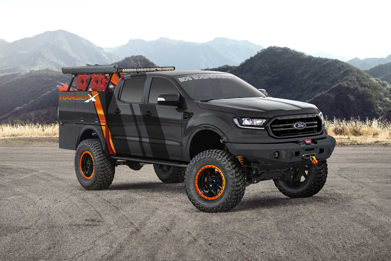Ford will have seven custom Rangers at the show with two of them at the Ford display. One of those is the black and white pre-runner from Ford Performance meant to go anywhere. It has the FX4 off-road package and 3.73 electronic locking rear diff along with Fox suspension and special BFG K02 all-terrain tires. The list of custom parts on that truck is very long.