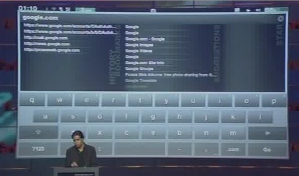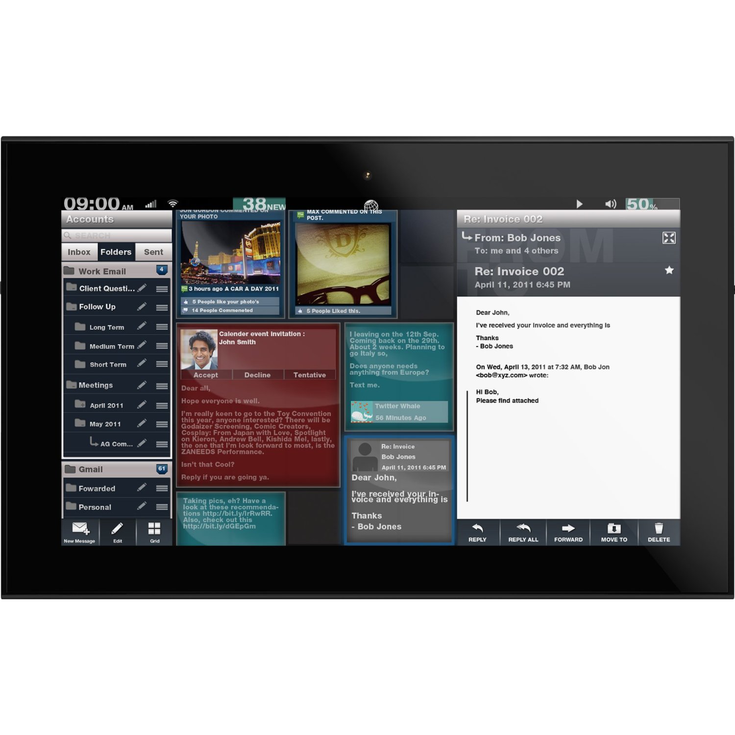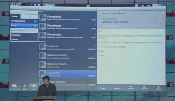 The Grid-layout homescreen consists of various "clusters" of apps, which can be collapsed into a single square, and using a grid-map to show an overview of whole desktop. Unlocking the device involves signing your name with your finger. There's a chromeless-browser and a new email app which can show messages in a traditional three-pane layout or by pulling important messages out as tiles.