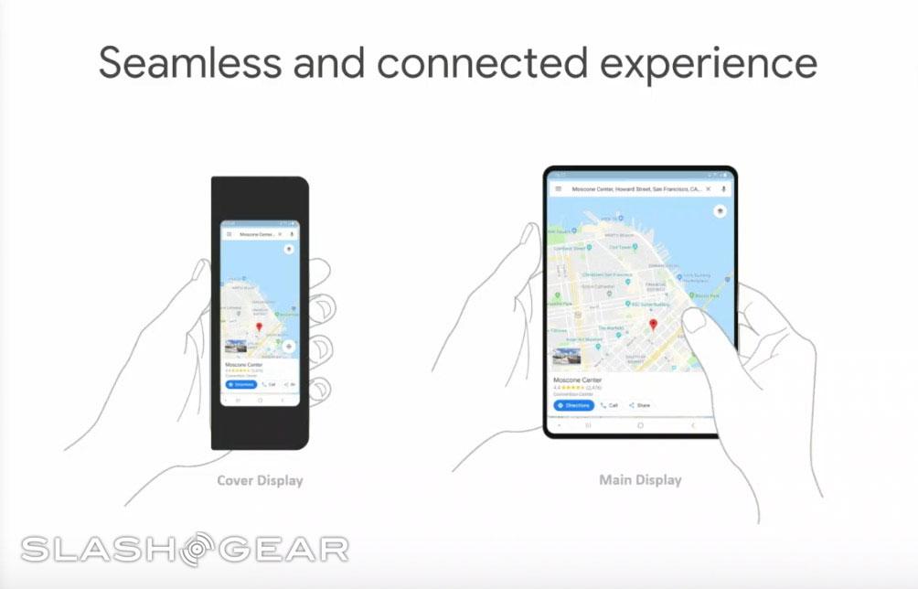Samsung Galaxy Foldable Device Specs:• Cover Display: 4.58-inches, 21:9 aspect ratio, HD+ (840 x 1960 pixels, 420 DPI, smallest screen width 320 dp, "screen size: normal"• Main Display: 7.3-inches, 4.2:3 aspect ratio, QXGA+ (1536 x 2152 pixels, 420 DPI, smallest screen width 585 dp, "screen size: large"• Display Tech Branding: Samsung Infinity Flex Display• Special Abilities: Folding display, support for multiple apps running at once in one window (called Multi Active Window by Samsung)