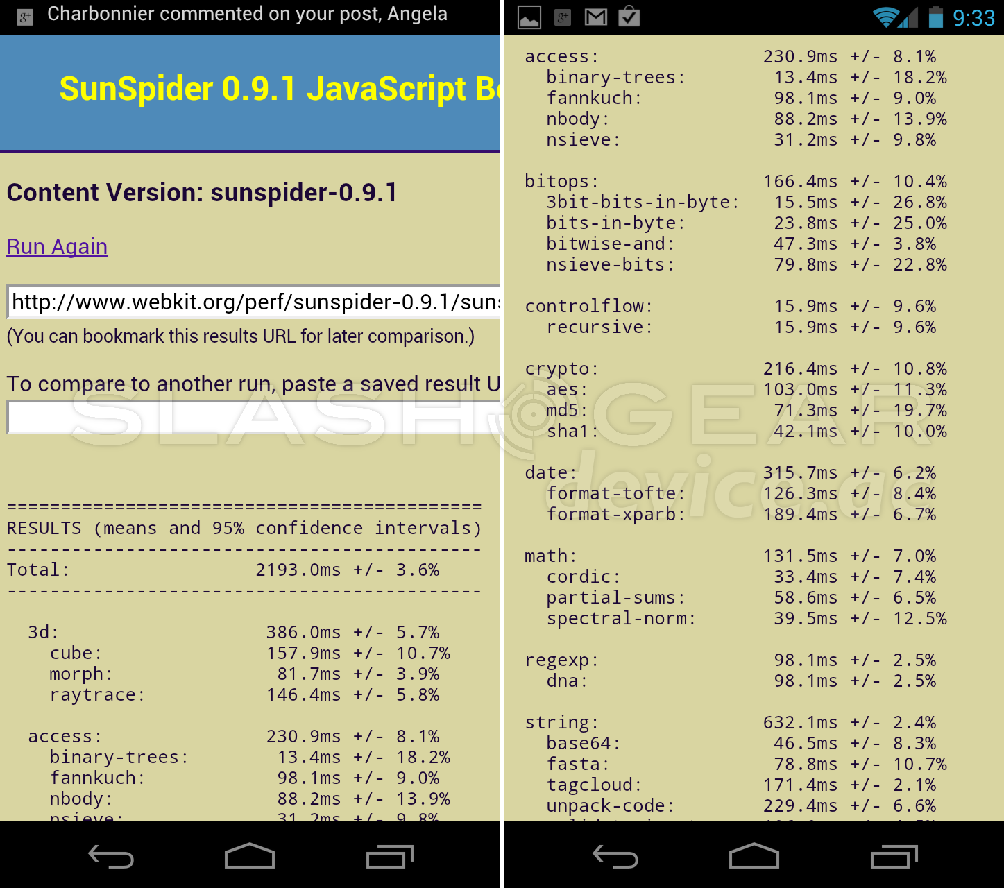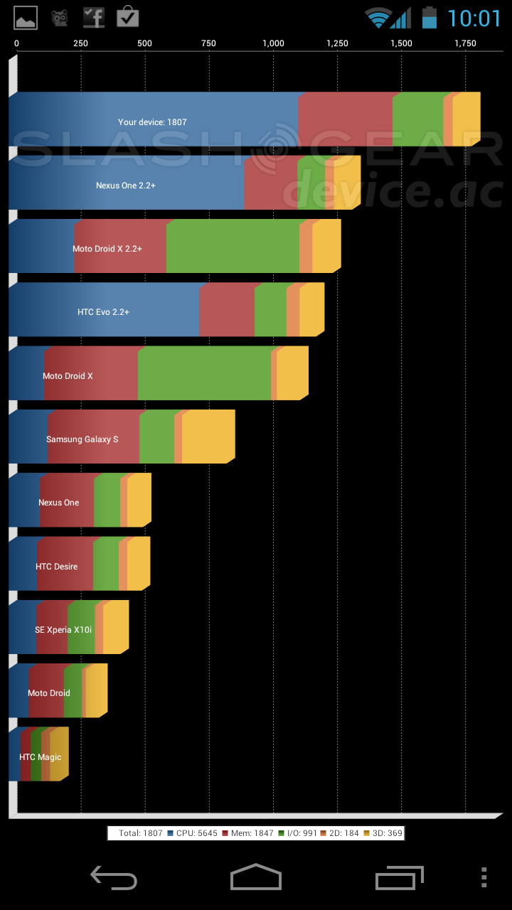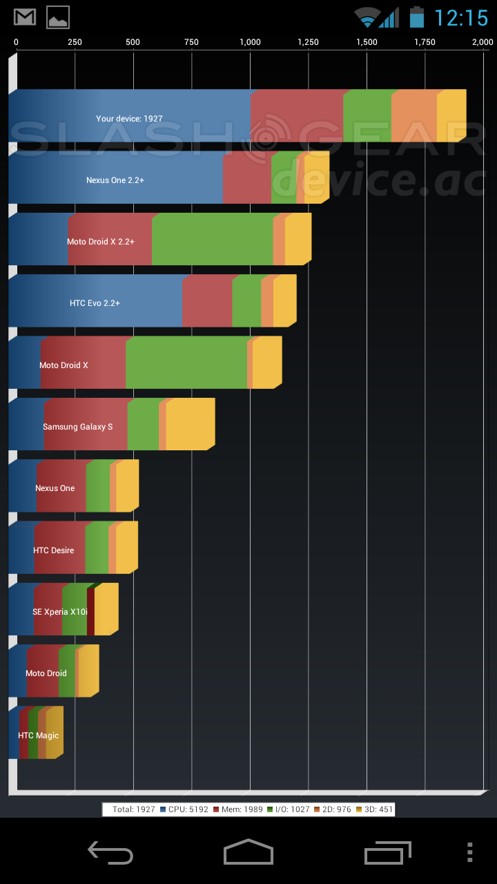 The scores you see here don't necessarily mean that the device is more or less powerful than any other in any more than a very general way, but you can get a basic idea of what its capable of by comparing the numbers to those we've collected in each of our reviewed devices found in the upper right-hand column of your browser. You can instantly see how well this device does against the common Samsung Galaxy S II score in CF-Bench, noting that while Java and Overall scores beat out the GSII by a narrow margin, the Native score remains on top for the Galaxy device. What this tells us is that the two devices are surprisingly similar in their ability to take this same test even though they use processors from different manufacturers.