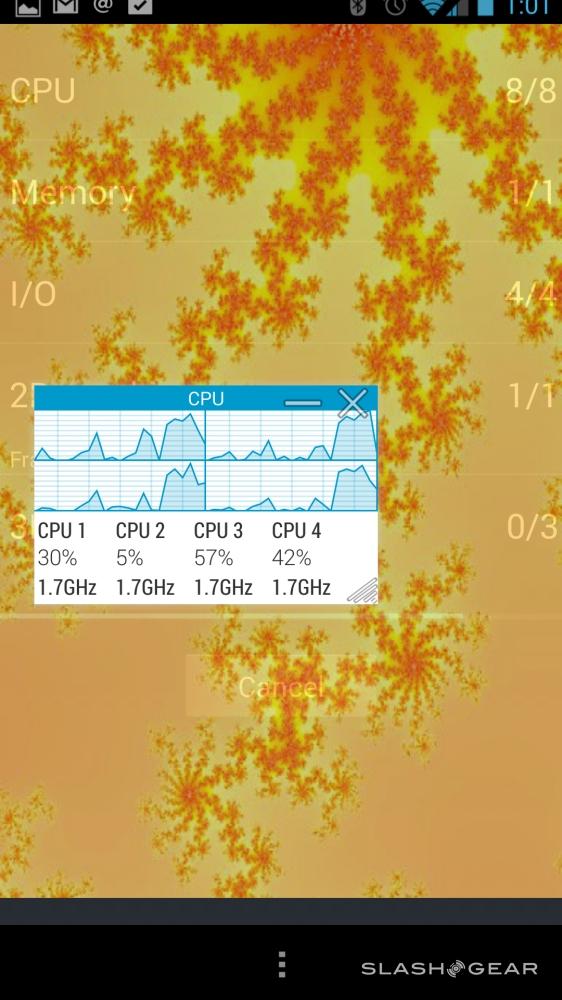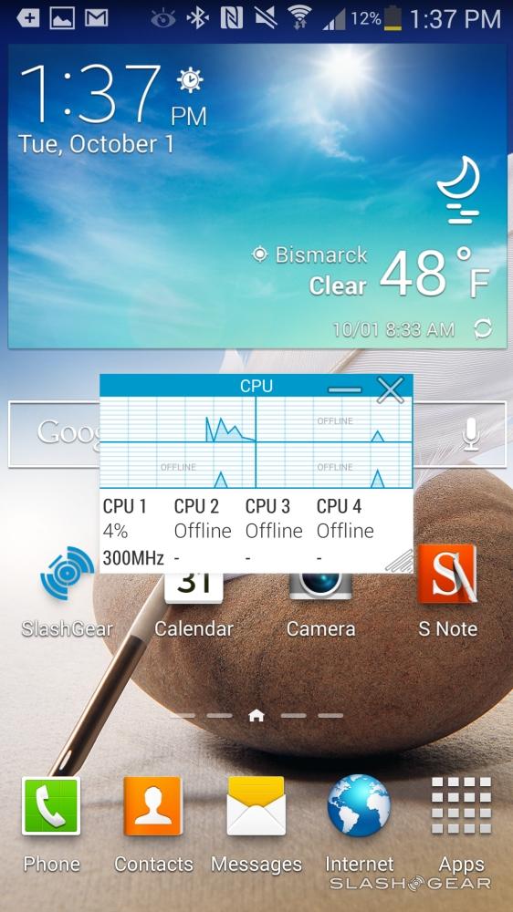 Next you'll see the Samsung Galaxy Note 3 working with an extremely similar set of results. This device works with a Qualcomm Snapdragon 800 quad-core processor, and you'll find one CPU core working outside of benchmark apps, and four working at full-clock inside benchmarking apps. Each of these benchmarking apps – and System Monitor – come directly from Google Play.
