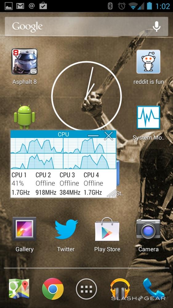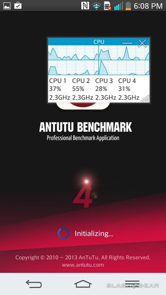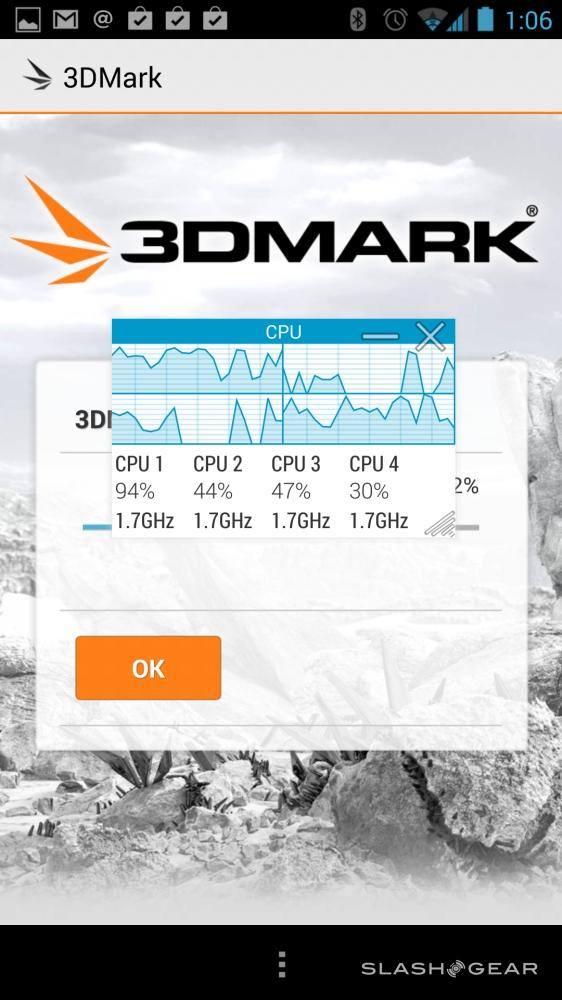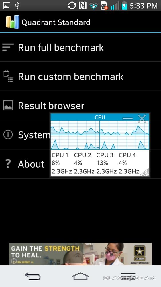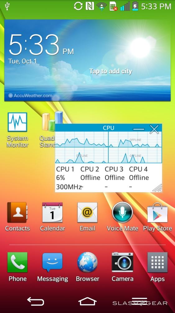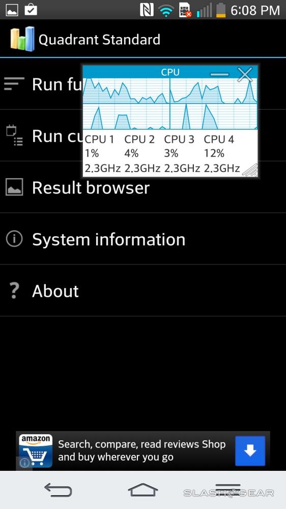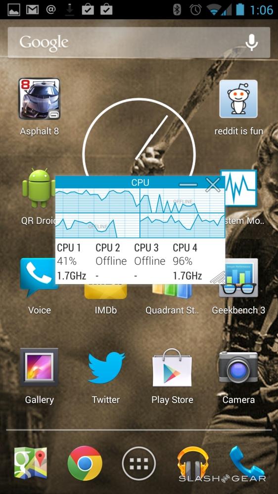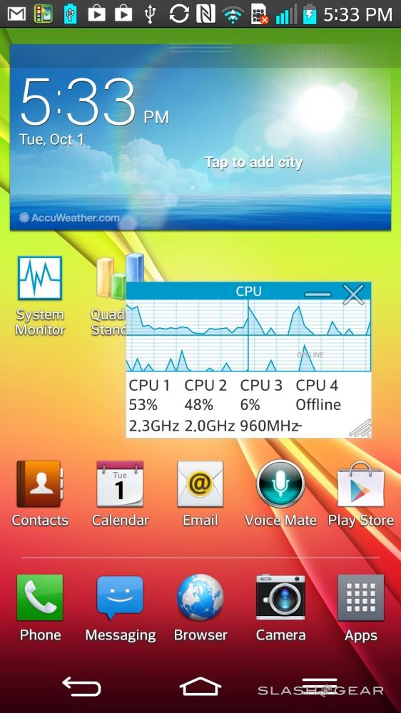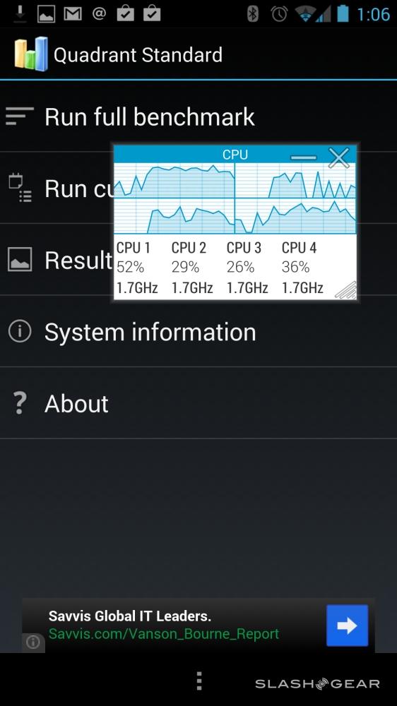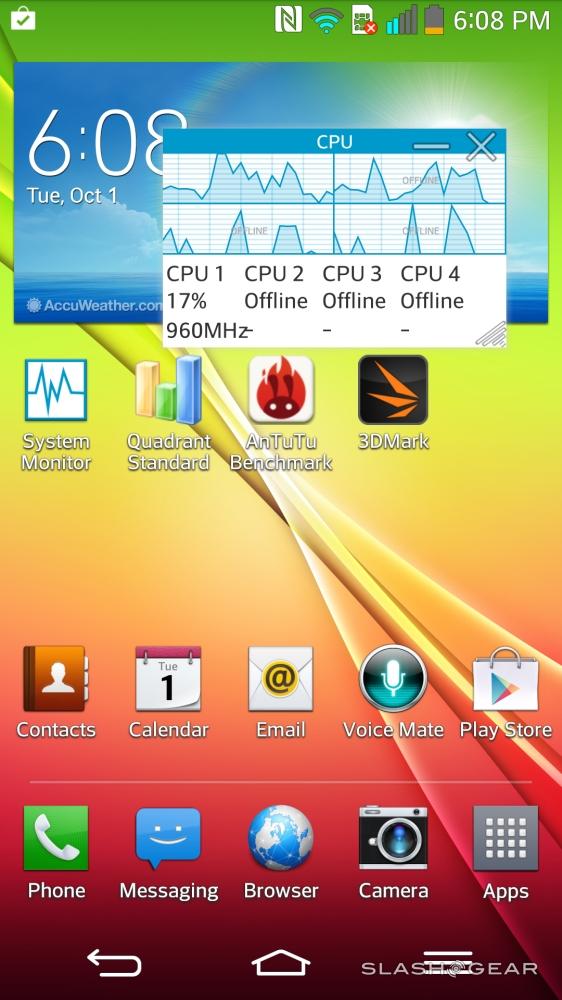 We've run the same System Monitor app by Christian Gollner on several devices – with more on the way. What we've found is that the Samsung Galaxy Note 3, the HTC One, and the LG G2 all work with similar boosts in benchmarking apps. While outside of these apps, each of these devices works with one CPU core or – at most – two CPU cores without apps running, it would seem that nearly without fail the four-core fire-up appears in most major benchmark tests.