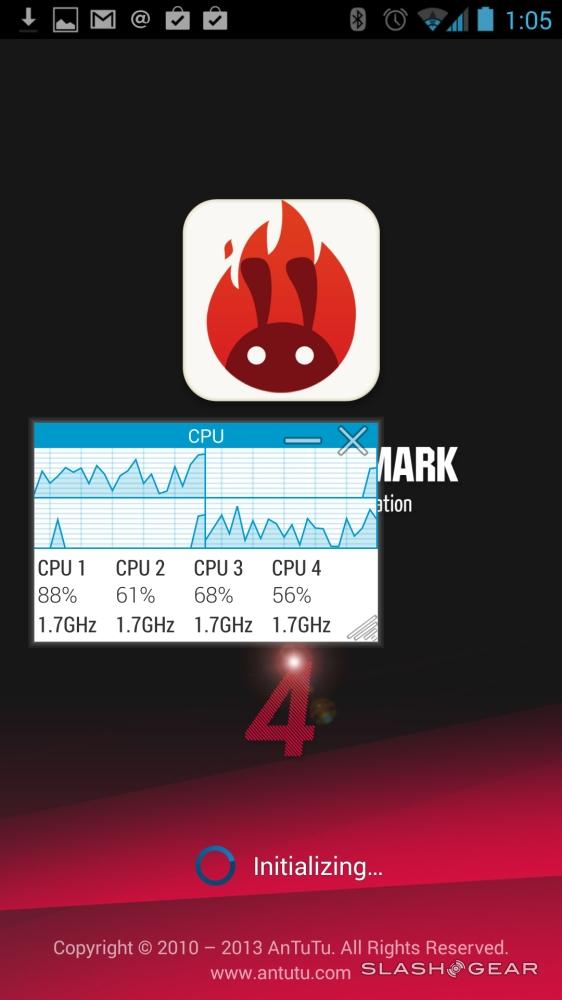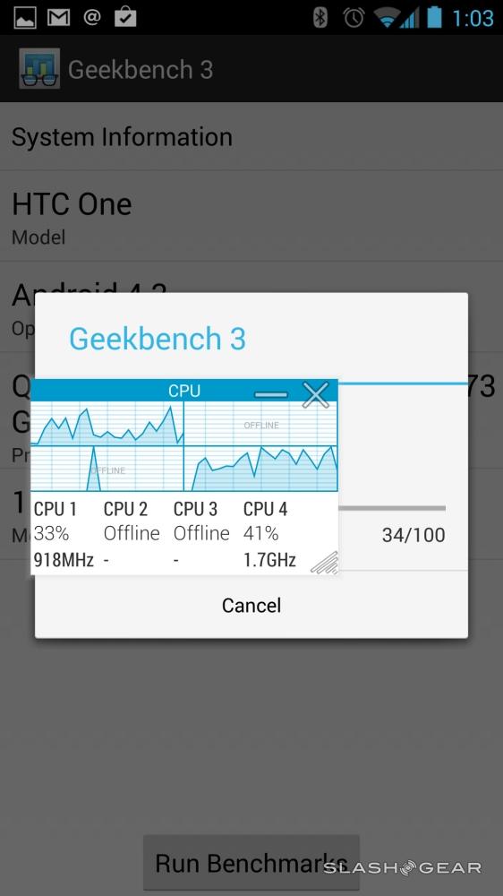 What you're seeing first is the HTC One, working here with a Nexus build as seen in the Google Play edition of the smartphone. Here you've got the Qualcomm Snapdragon 600 quad-core processor under the hood, and you'll find each core running full-speed whenever each one of the following benchmark apps are initiated: Geekbench 3, Quadrant Standard, Antutu Benchmark, and 3DMark.