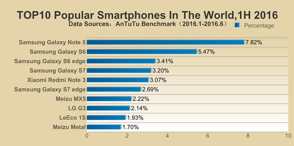 Normally when we are talking about AnTuTu, we are looking at benchmarks for one smartphone or another. Since so many users around the world use the benchmarking tools at AnTuTu, the company is able to put together some lists of the most popular devices based on usage of its benchmarking tools from all around the world. Overall, the most popular devices in the world for the first half of 2016 include (in order from most popular to least) the Galaxy Note 5, Galaxy S6, Galaxy S6 Edge, Galaxy S7, and the Xiaomi Redmi Note 3.