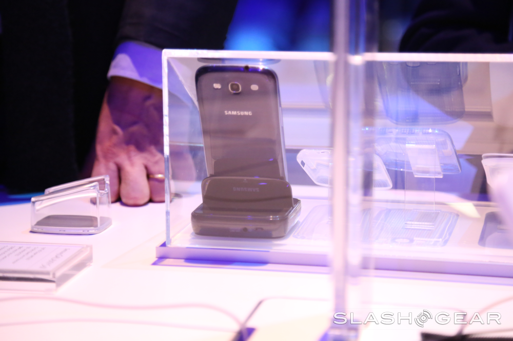 Today we've gotten the opportunity to not only get a look at the Galaxy S III in-person, but to look at the accessories that go with it as well. What you'll see here is a set of fold-over covers, cases of all shapes and sizes, and a charging dock that's almost, but not quite, that lovely wireless charger you've heard so much about. You'll also get a peek at the Samsung S Pebble, also known as a tiny MP3 player accessory that connects to your Galaxy S III with a tap, and a peek at AllShare Cast for wireless transmission of HD video!