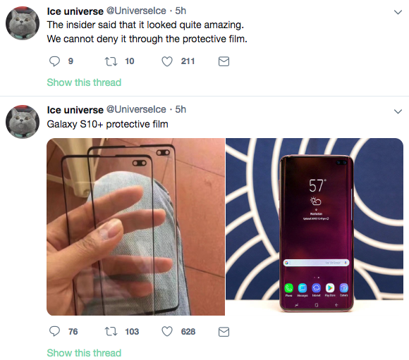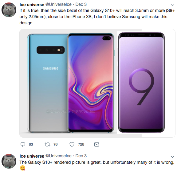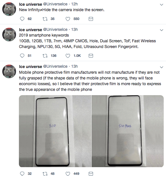 If we look at the designs whipped up by the kitty cat known as Ice Universe, we see what's likely the closest we've yet gotten to a final phone for Samsung in the year 2019. What's interesting here is the multiple different takes that accessory-makers seem to be making with screen protectors. One has room for front-facing cameras with a black pill-shaped section and likely holes or different glass in place. The other just keeps the same sort of glass throughout.