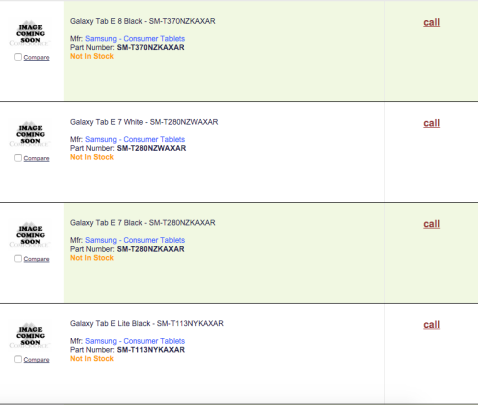 While the listings showed up on the website, they didn't include any indication of specifications. There are some rumors about the specs of the Galaxy Tab E 7.0 floating around. A 7-inch screen is a given, the processor is tipped as a 1.3GHz unit mated with 1.5GB of RAM.