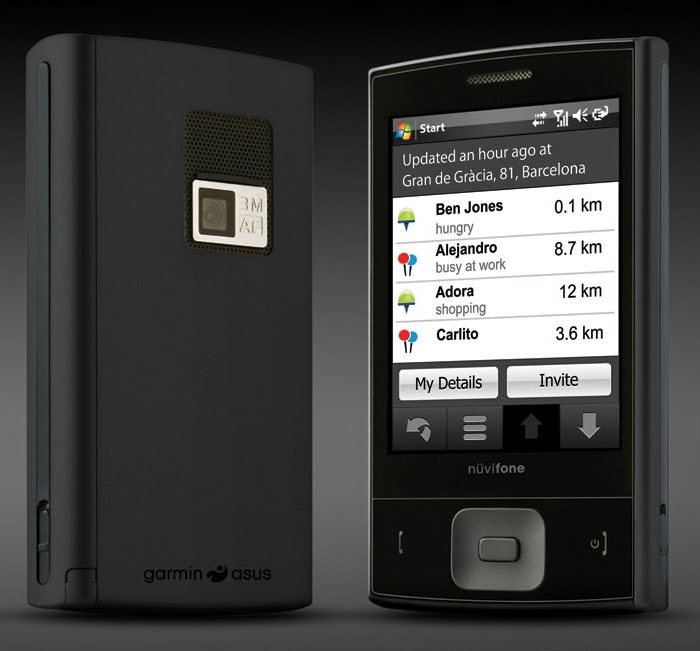 In addition, since there's an always-on data connection, the M20 throws in traffic information, White Pages, weather, flight status, local events, and movie times, together with links to social networking services with location mapping through Ciao!, which sounds quite a lot like Google Latitude. Details are scarce, but there also looks to be a custom GUI on top of WM6.1, and we also now the nuvifone M20 will come with either 4GB or 8GB of storage, and a 3-megapixel camera with geotagging.