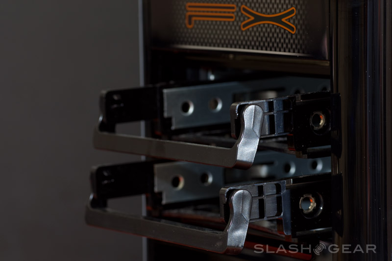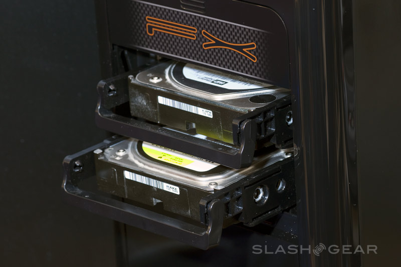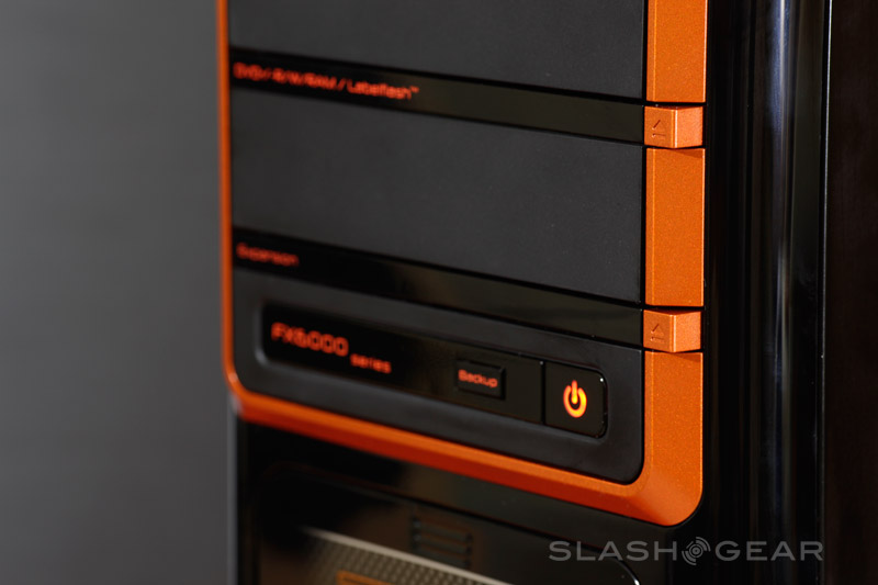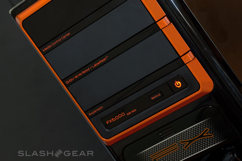 The FX 6800-05 shares the same 31lb shell as the 6800-01 with a fingerprint-magnet piano-black plastic finish, unexciting color scheme with orange metallic accents and cheap construction. On the plus side, it's cleverly designed with many connectivity options that are useful and well hidden. There's one multimedia card reader in a pop-up hatch on top of the case, a pivot-out bay with microphone and headphone jacks and a 400 Firewire socket, and a pair of hot-swappable SATA bays behind a top-down sliding door. Unfortunately, they're poorly assembled and difficult to operate. The slide door managed to both rattle and be stiff to open, while the hide-away top panel was simply impossible to release without a fist.