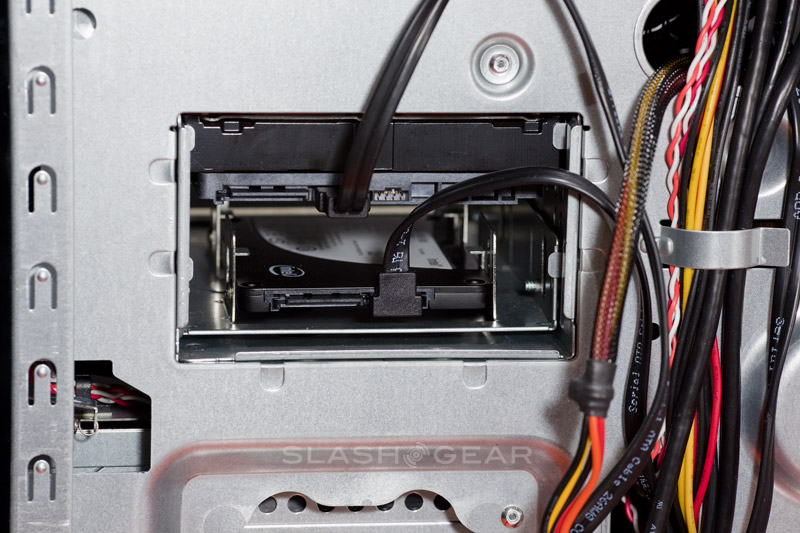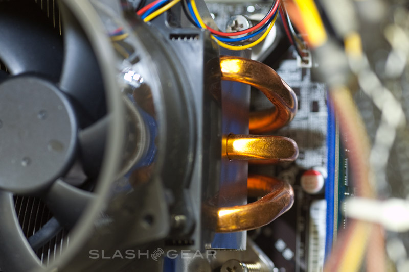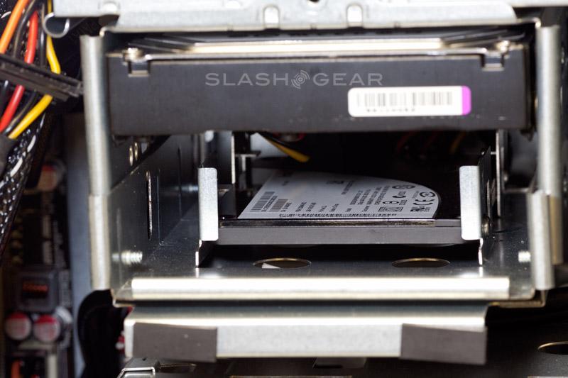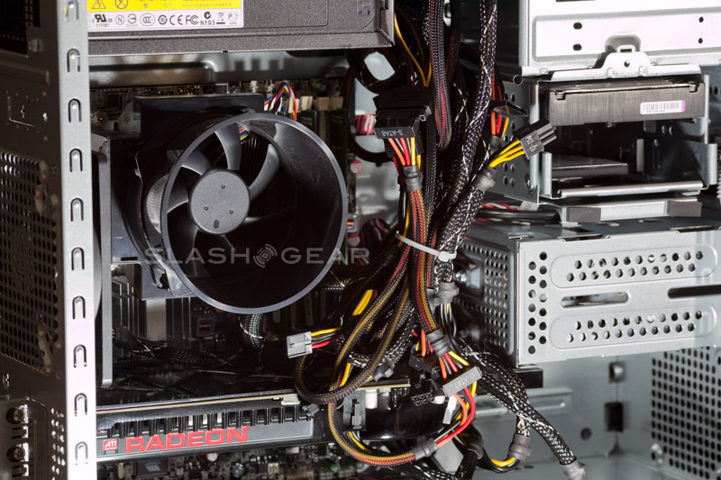 Hard drives are mounted sideways in a removable cage, and accessible only from the side door. Removing one will require both doors to be unbolted, as the SATA cables are fitted tightly and only reachable from the other side of the door. Cooling includes one 120mm exhaust fan, one 120mm PSU fan and the processor has a side-intake CPU fan on top on a heat-sink. With its relatively thick heat pipes to dissipate excessive heat from the CPU, the Gateway gives you a small taste of custom air cooling.