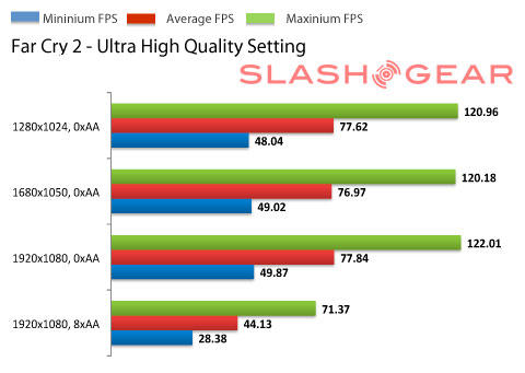 We ran a number of test sets at three resolution settings — 1280x1024, 1680x1050 and 1920x1080 — at DX 10 and Ultra High quality for 3 loops each. Anti-aliasing was set to 0x for all three resolutions, then 8x for 1920x1080. The system scored an impressive 77 fps (average) and maxed out at around 120 fps. Results show setting the system at 0xAA has no impact at any resolution, but a much more aggressive 8xAA setting brought the score down to 44 fps (average).