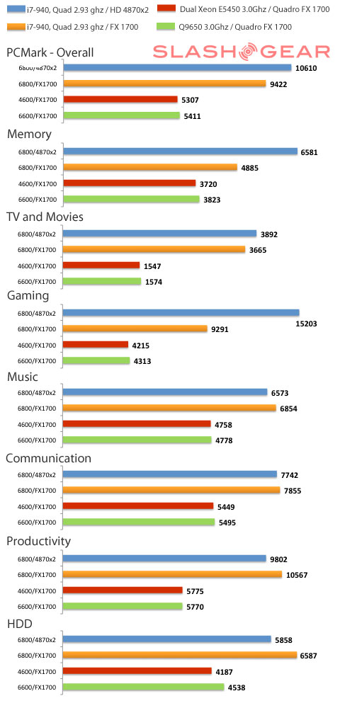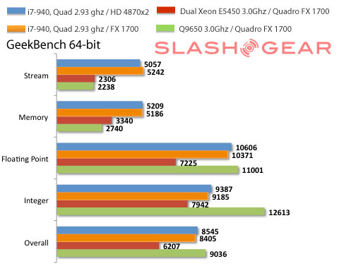 With a faster processor and extra memory, we revisited GeekBench and added a Dual Xeon E5450 workstation int the group. Keep in mind that Geekbench only measures processor and memory performance, so the benefit of an SSD won't register. As expected, the advantage of DDR3 and greater memory gave the new FX twice the score in the Stream and Memory categories, but once again, it fell short in the computing department. The overall performance favored the Q9650 for the second time.