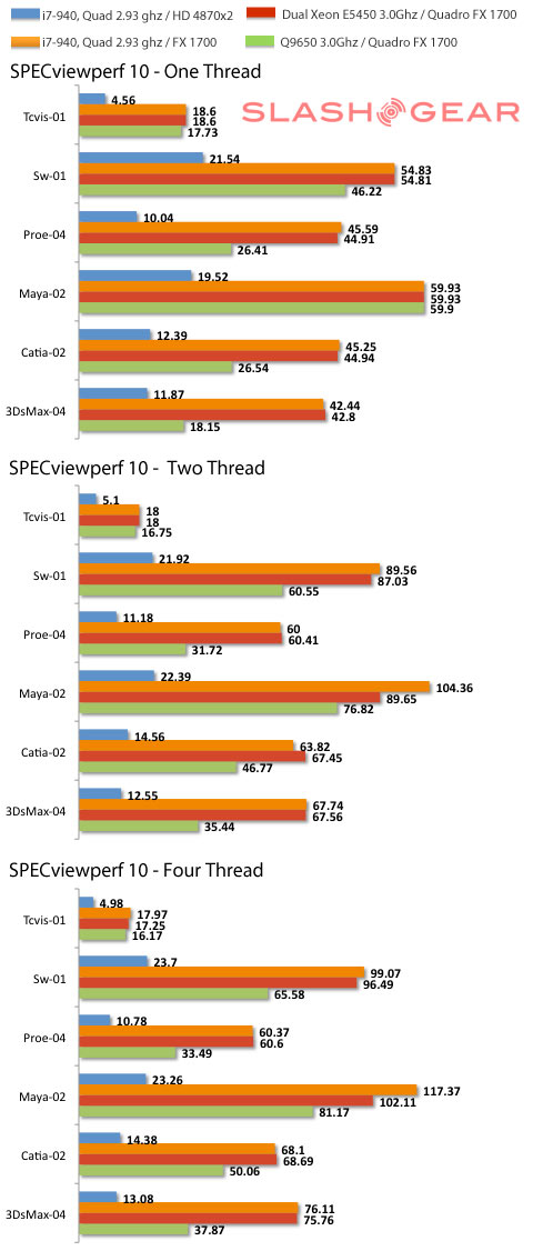 The Gateway's GPU isn't prepared for DCC/CAD professionals, the gaming counterparts performed poorly as expected, thus we added a Quadro GPU in our Specview 10 benchmark that's designed primarily to measure OpenGL performance. Driven by the new system, the midrange workstation-grade Quadro FX1700 was, in most cases, neck to neck with the Dual Xeon workstation, but overall a new leader was found. It also stood out in the Maya test, when it comes to extra threads, but not by an especially large margin.