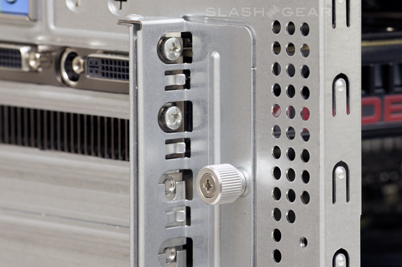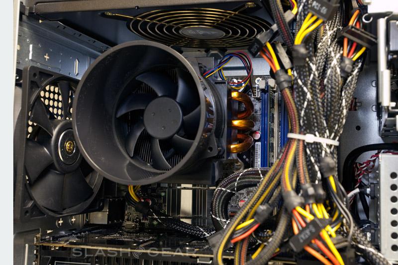 Inside the case there's a 1000-watt power supply and chunk of cables with little room to breath. The cables are neatly tied but the case is simply too small to accommodate them all; in addition, the presence of the extra long and beefy 4870 x2 video card obviously didn't help. But there's no 'small' alternative in the graphics department to the dual GPU 4870 x2 with 2GB of GDDR5 RAM. That thing is a beast and requires an extra bracket to hold it stable.