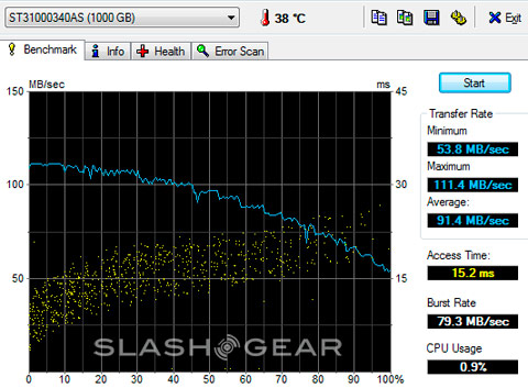 In the Photoshop retouch-artist speed test, the Gateway finished at 17.7s and 17.0s respectively in a 32-bit and 64-bit variant of Photoshop CS4. The score remained the same whether the scratch disk was assigned to the SSD or the 1TB data drive. With restricted memory – only 1.5GB assigned for the app – and bumping the image file from 8 bit to 16 bit, the 1TB was surprisingly a better scratch disk than the SSD, clocking in at a whole 6 seconds faster at 1 minute. Editing a large image file in Photoshop would put a fast hard drive to good use (as a scratch disk); by restricting the RAM, the task is executed with virtual memory relocated to the physical disk when the RAM allowance runs out.