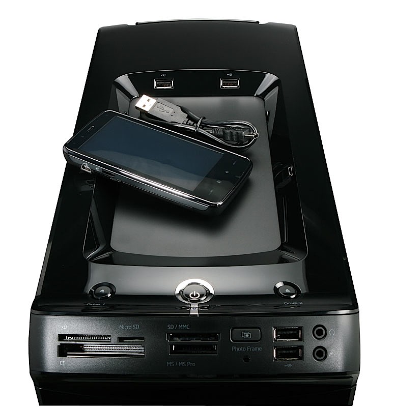 To make transferring photos and other data to the PCs easier, Gateway included a handy "device deck" on the new systems. This small recessed area on top of the chassis is the perfect spot to set a camera, MP3 player or camcorder while connecting to USB ports and downloading media.