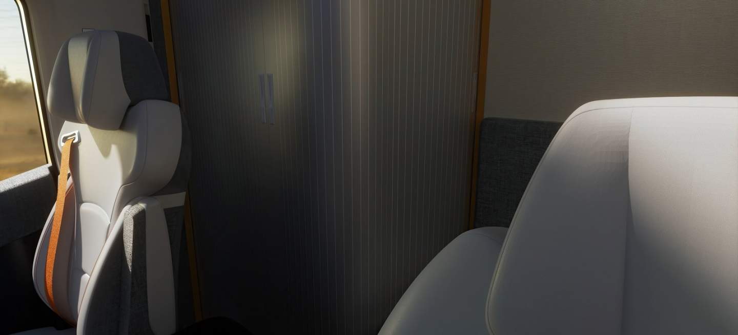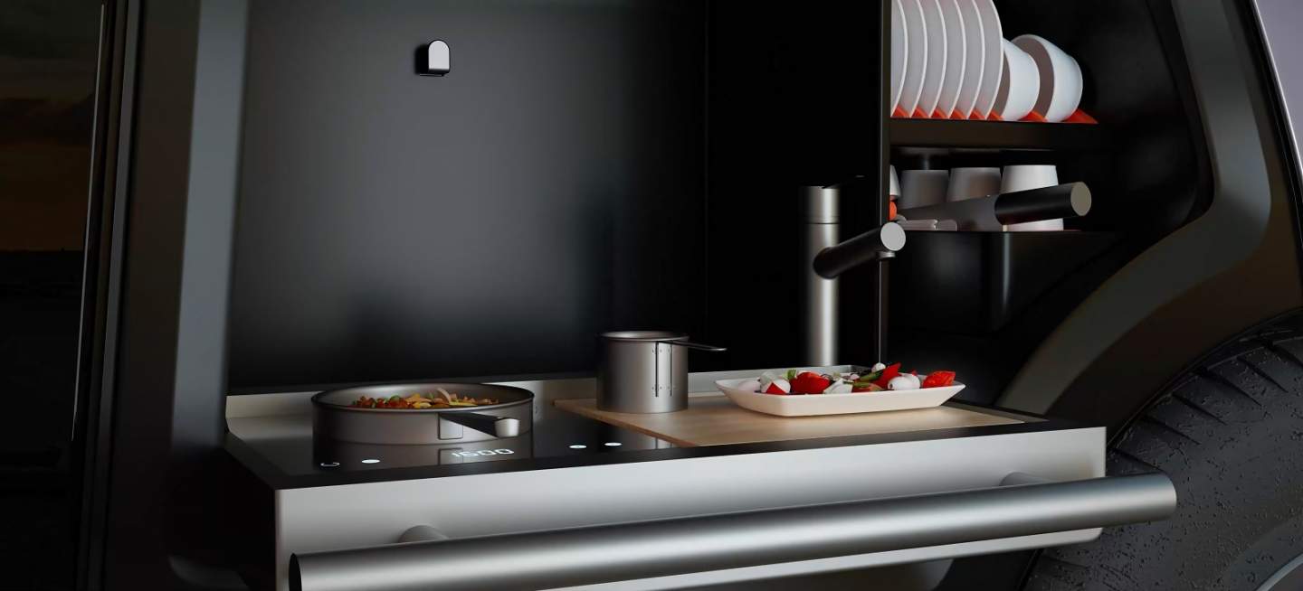 Inside, Homtruck is as plush as an expensive German saloon with soft-touch fabrics, sustainable plastics, and bamboo grain materials harvested from the forests of China. The cockpit has a single bed, a refrigerator, a kitchen, a tea maker, and a washing machine. It also has a shower and toilet.