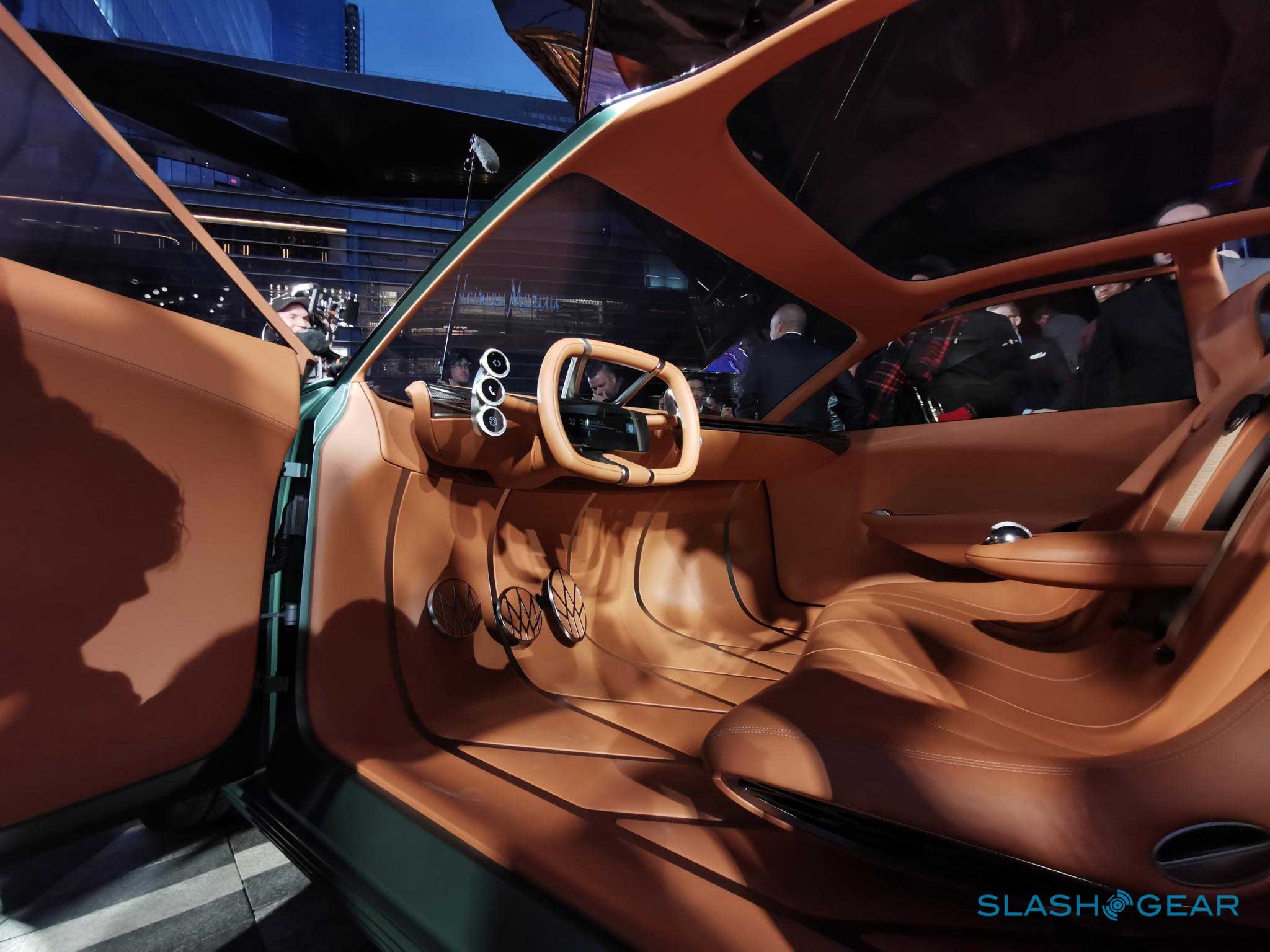 The Mint Concept has no trunk, offering instead a "generous parcel shelf" meant for occasional use. Access to the parcel shelf is via scissor-style side openings with a low load-in point for easy storage and retrieval of items. Genesis says that the Mint Concept has high-density, battery-electric powertrain that is good for an estimated 200 miles per charge and the concept can recharge using 350-KW fast chargers.