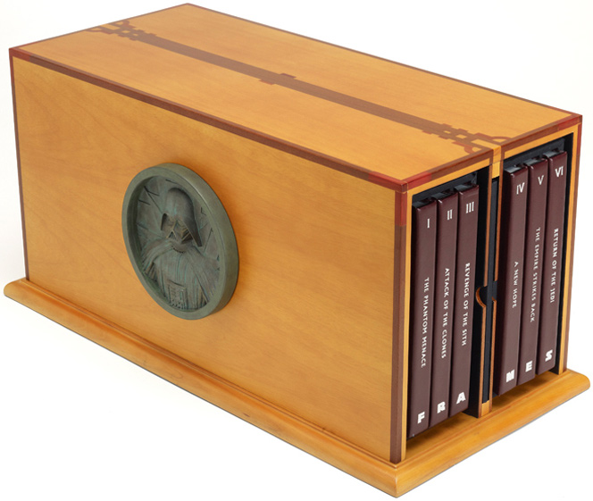 This set is limited edition – can you guess the number of sets that have been made? That's right, 1,138 numbered and signed wood boxes filled with the 6 books in the edition have been created and can be yours for the low low price of $3,000. The box has a Darth Vader seal on one side and a Yoda seal on the other, the wood case is art deco inspired, and each set comes with a certificate of authenticity signed by George Lucas himself.