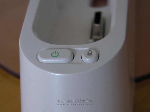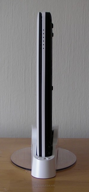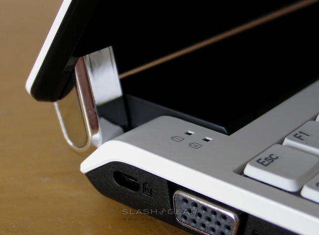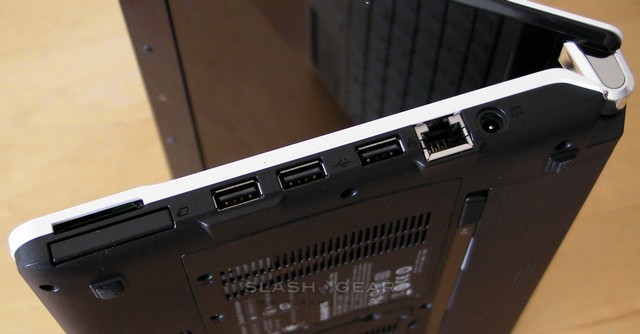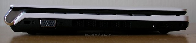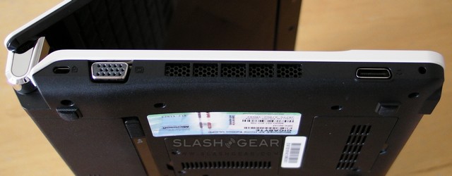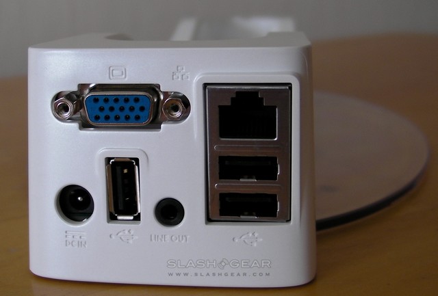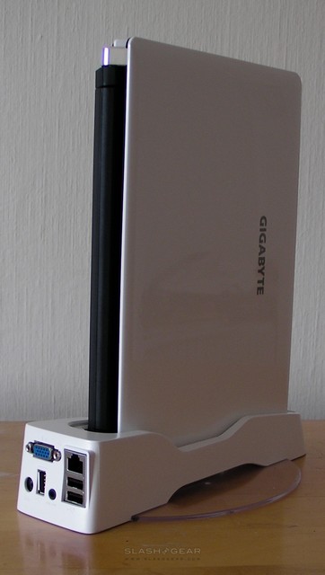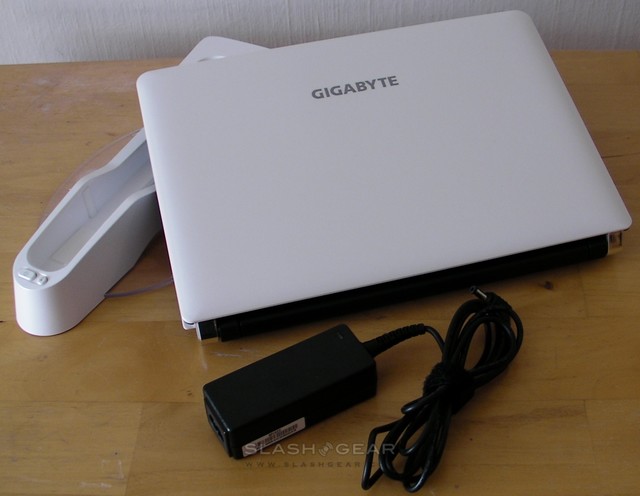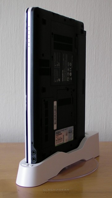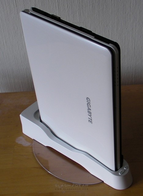 Gigabyte have taken the middle-ground with the Booktop's dock. With three USB 2.0 ports, ethernet, VGA output, power and a line-out socket, it provides more than just keyboard/mouse connectivity, but doesn't offer anything that the M1022 itself hasn't got. The netbook sits upright, connected by a proprietary socket, and there are power and battery buttons on the front panel of the dock so that you can control the M1022 while the screen is closed.