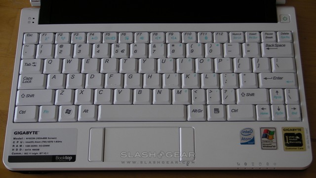 Still, that usage scenario describes an awful lot of PC owners, and there are plenty of people out there contented with what their netbooks are doing for them. Couple the convenience and portability of a well put-together 10.2-inch machine with the flexibility of using eye- and hand-friendly full-sized peripherals and that's a convenient bonus. Gigabyte suggest you'll see around 7 hours of use out of the standard 6-cell, 7,800mAh battery pack; that's the usual ambitious estimate, but we saw over five hours of casual browsing over WiFi, typing and emailing.