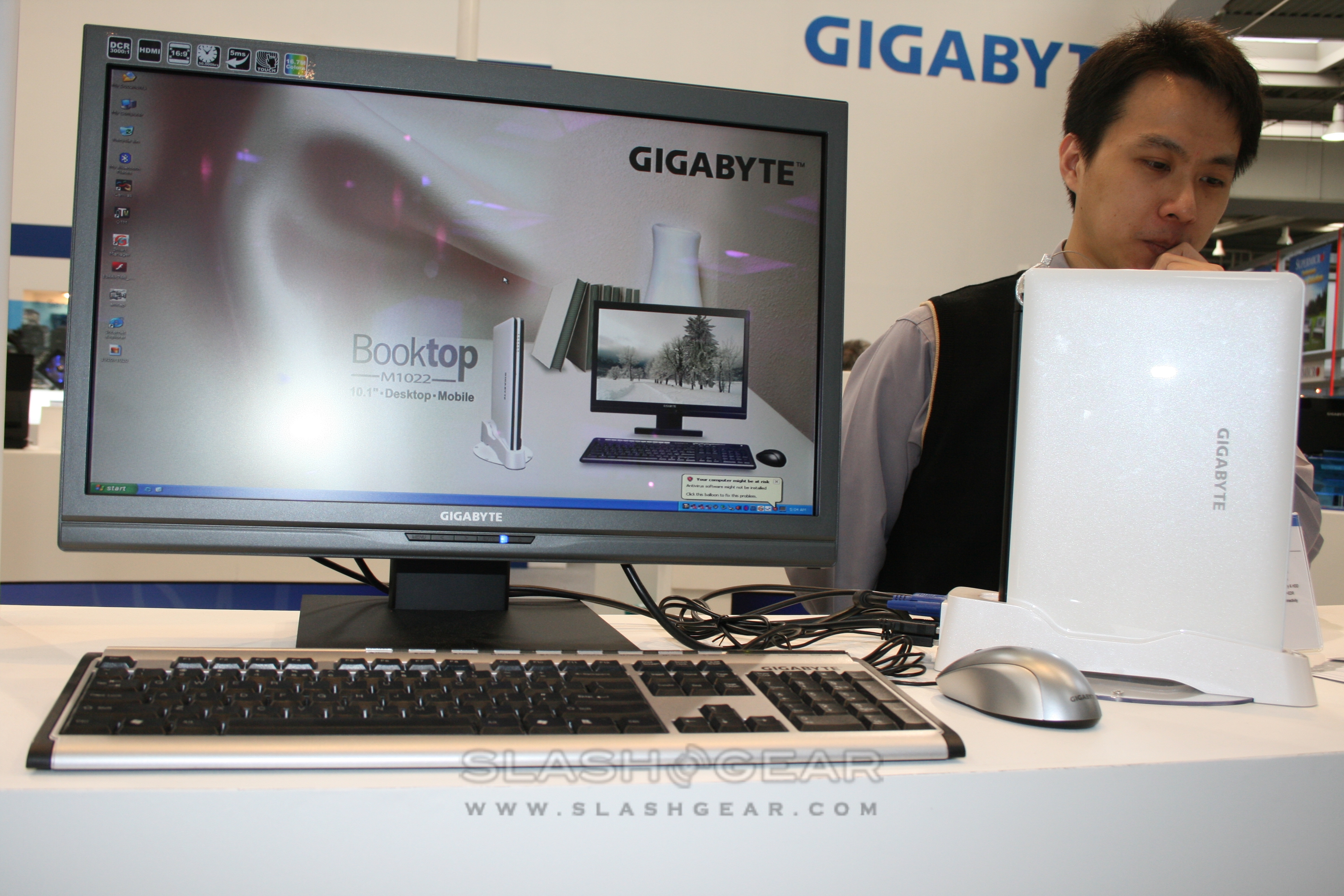 Docking stations for laptops aren't new, but offering one for a netbook is. That's what Gigabyte have brought along to CeBIT this year, in the shape of the Gigabyte Booktop M1022, a 10.1-inch WXGA netbook running Intel's Atom N270 1.6GHz processor that has a special upright dock offering connectivity to a standalone monitor and peripherals.